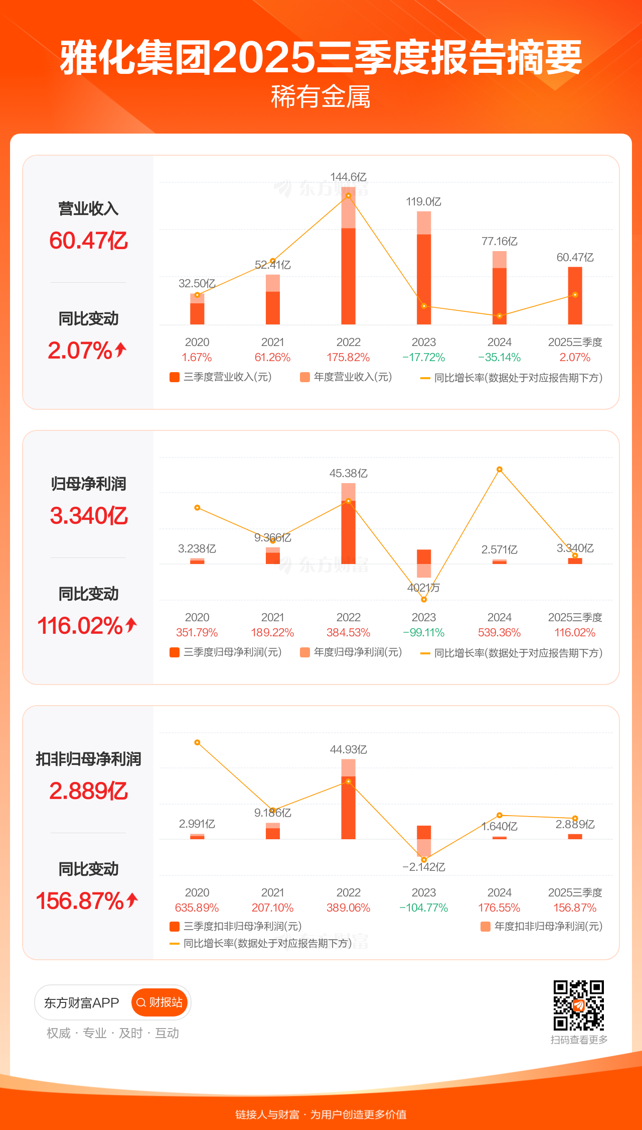 雅化集团10月30日发布2025年三季报显示,公司前三季实现营业收入60.47亿元,同比增长2.07%;归母净利润3.34亿元,同比增长116.02%;扣非归母净利润2.89亿元,同比增长156.87%。