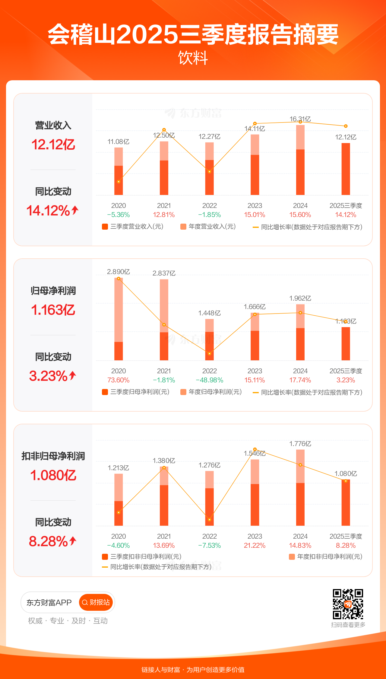 会稽山10月30日发布2025年三季报显示,公司前三季实现营业收入12.12亿元,同比增长14.12%;归母净利润1.16亿元,同比增长3.23%;扣非归母净利润1.08亿元,同比增长8.28%。