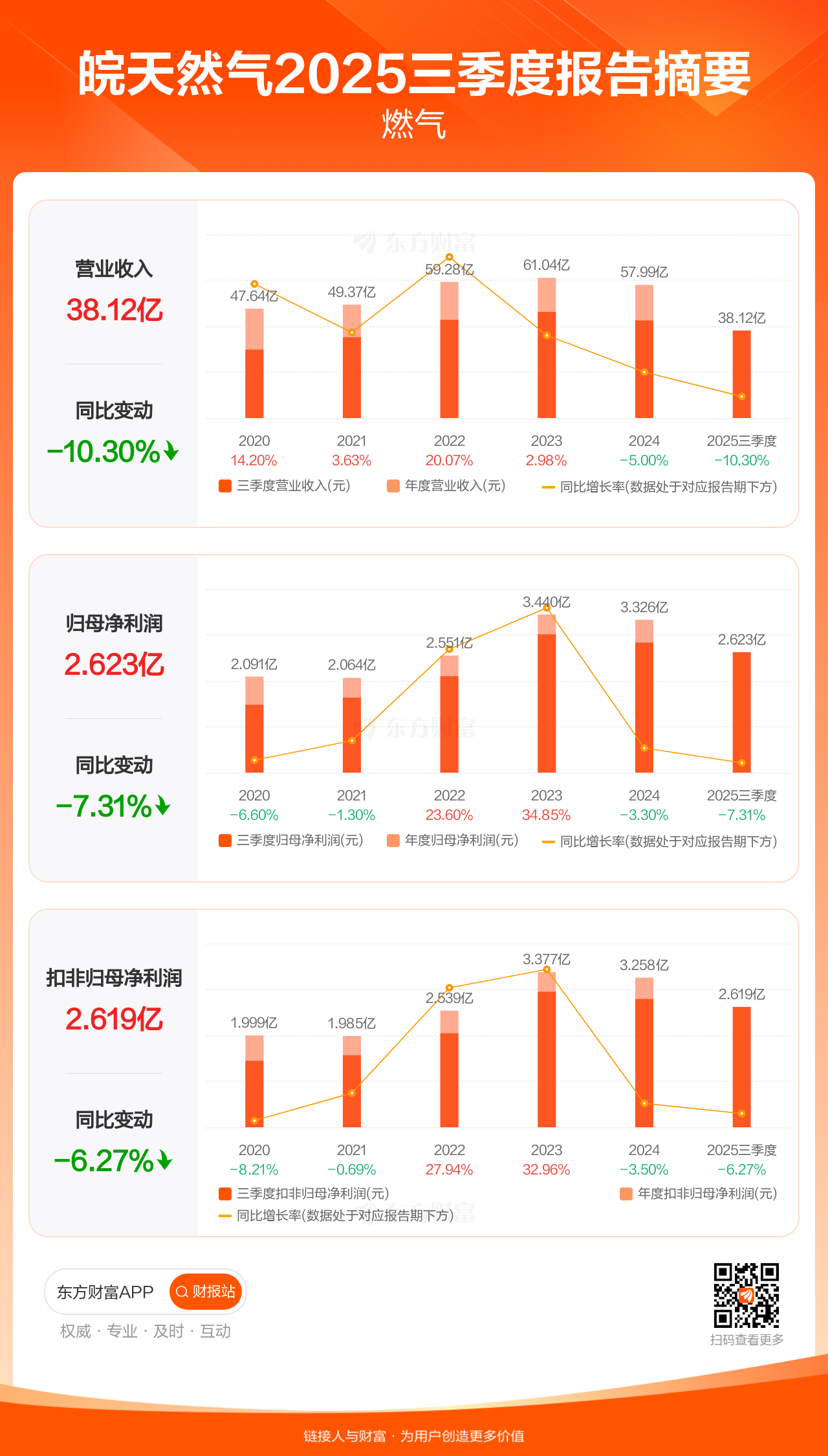 皖天然气10月30日发布2025年三季报显示,公司前三季实现营业收入38.12亿元,同比下滑10.30%;归母净利润2.62亿元,同比下滑7.31%;扣非归母净利润2.62亿元,同比下滑6.27%。
