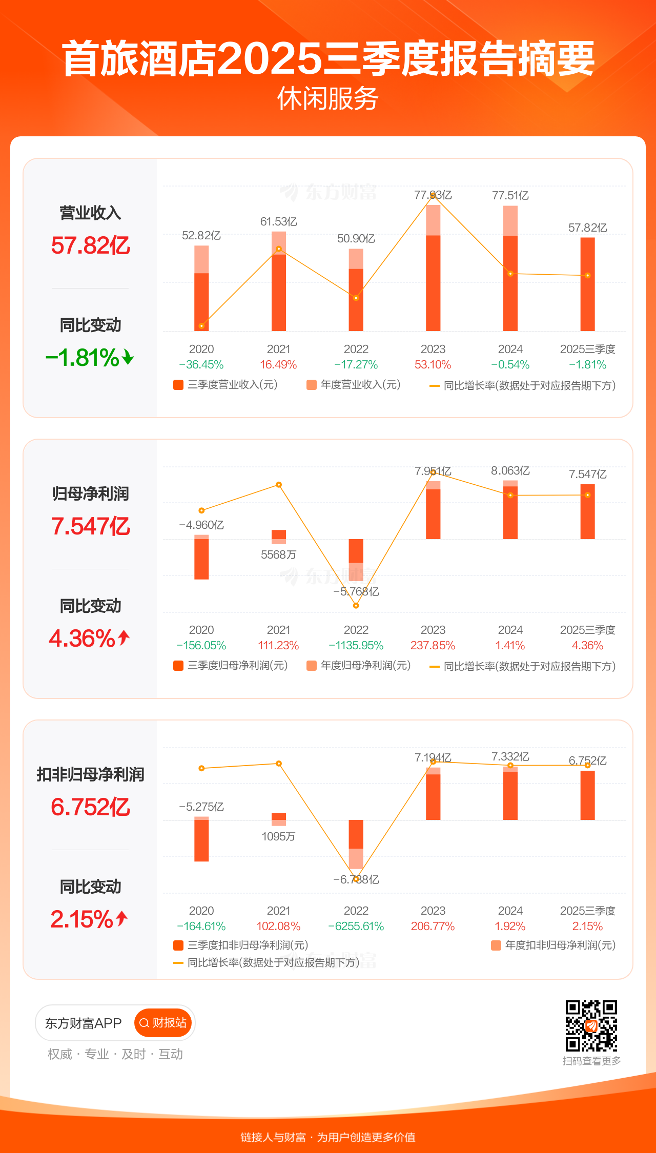 首旅酒店10月30日发布2025年三季报显示,公司前三季实现营业收入57.82亿元,同比下滑1.81%;归母净利润7.55亿元,同比增长4.36%;扣非归母净利润6.75亿元,同比增长2.15%。