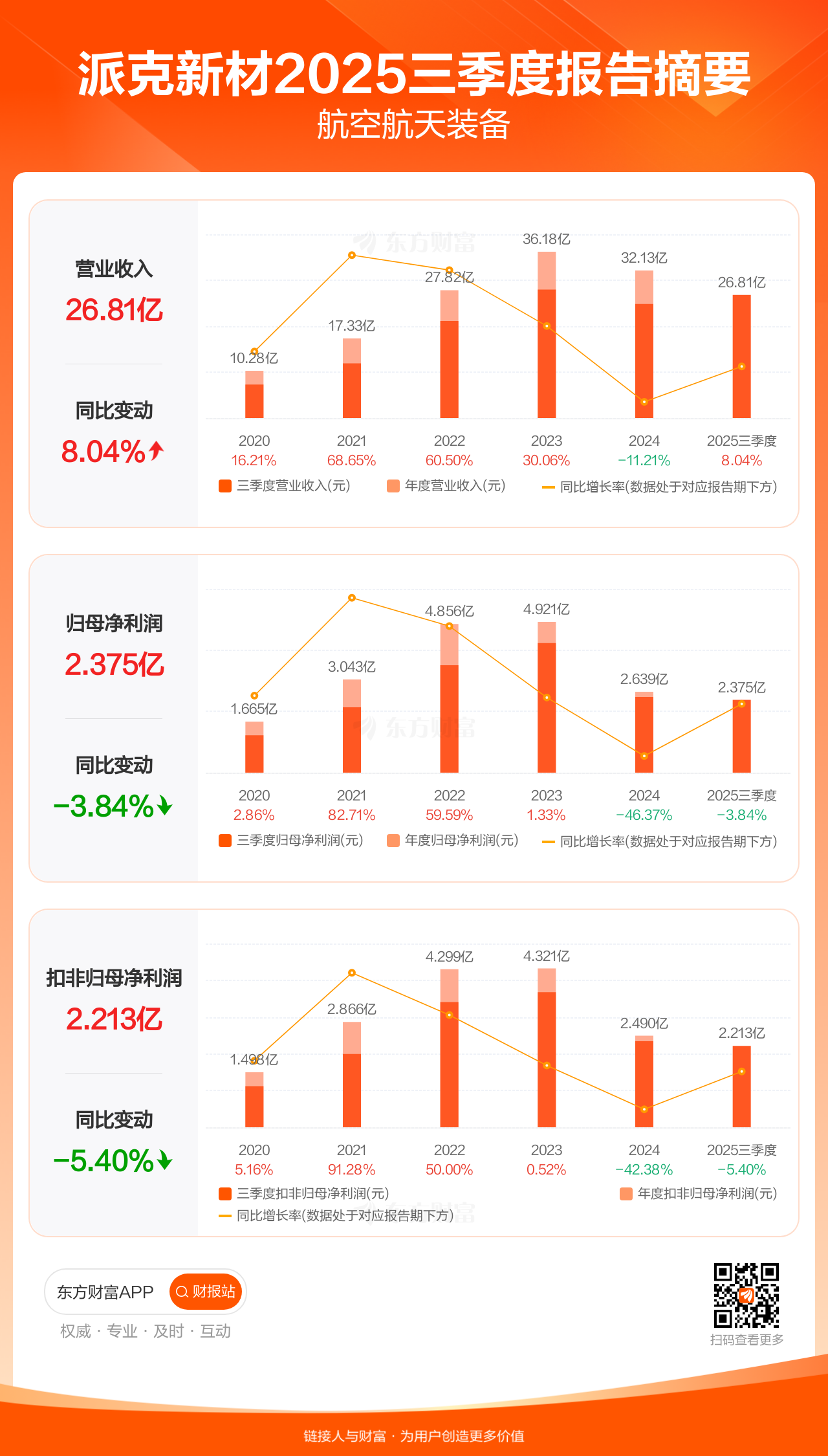 派克新材10月30日发布2025年三季报显示,公司前三季实现营业收入26.81亿元,同比增长8.04%;归母净利润2.37亿元,同比下滑3.84%;扣非归母净利润2.21亿元,同比下滑5.40%。