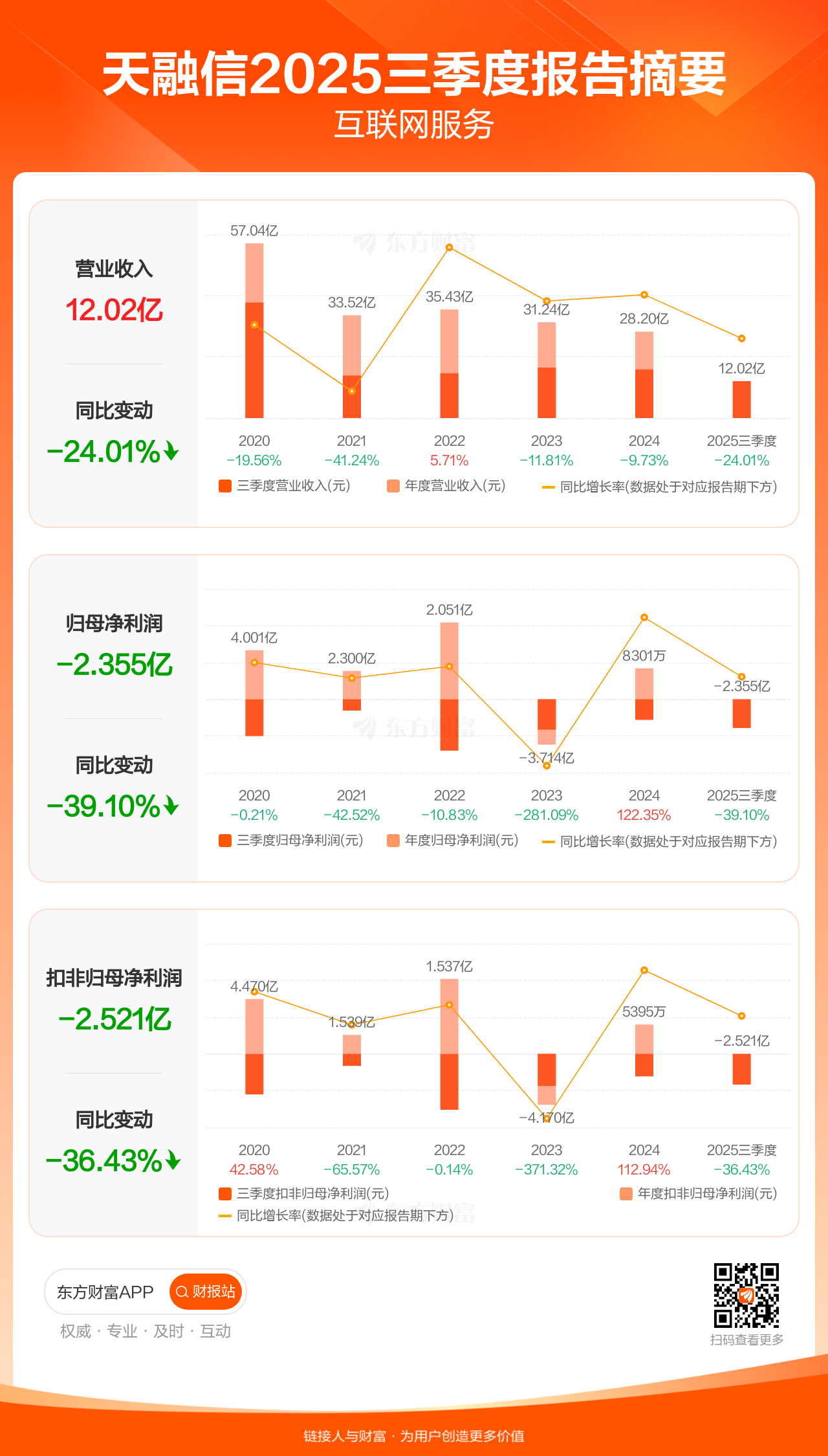 天融信10月30日发布2025年三季报显示,公司前三季实现营业收入12.02亿元,同比下滑24.01%;归母净利润-2.35亿元;扣非归母净利润-2.52亿元。