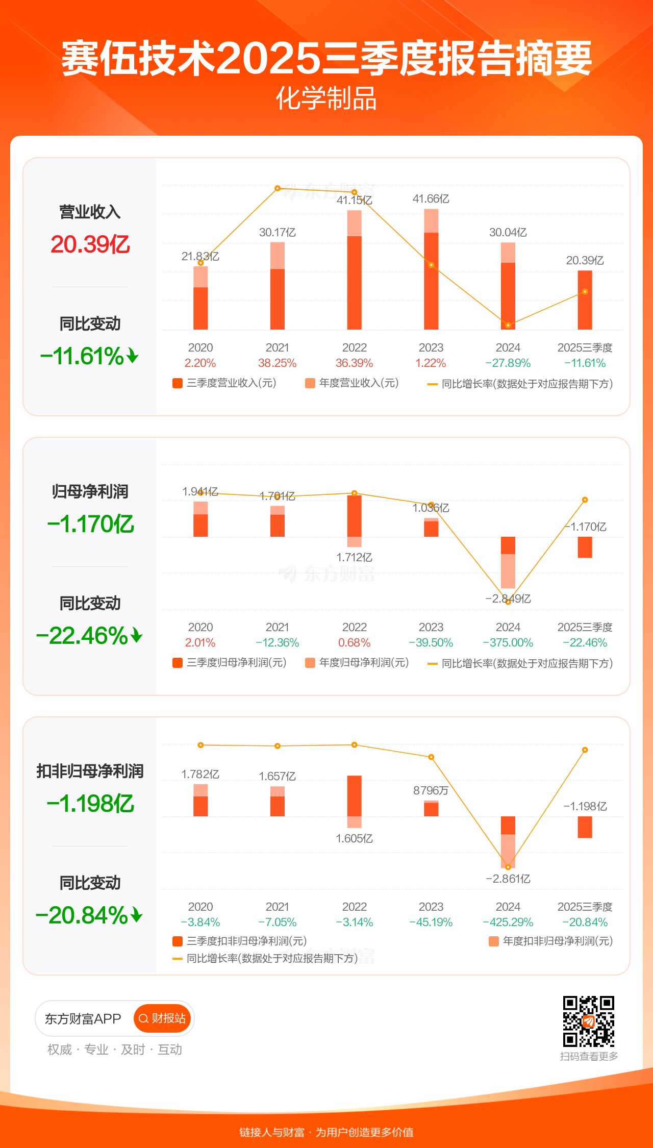 赛伍技术10月30日发布2025年三季报显示,公司前三季实现营业收入20.39亿元,同比下滑11.61%;归母净利润-1.17亿元;扣非归母净利润-1.20亿元。
