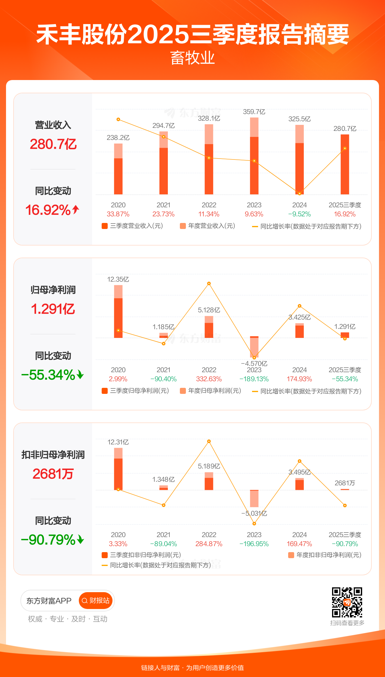 禾丰股份10月30日发布2025年三季报显示,公司前三季实现营业收入280.73亿元,同比增长16.92%;归母净利润1.29亿元,同比下滑55.34%;扣非归母净利润2681.35万元,同比下滑90.79%。