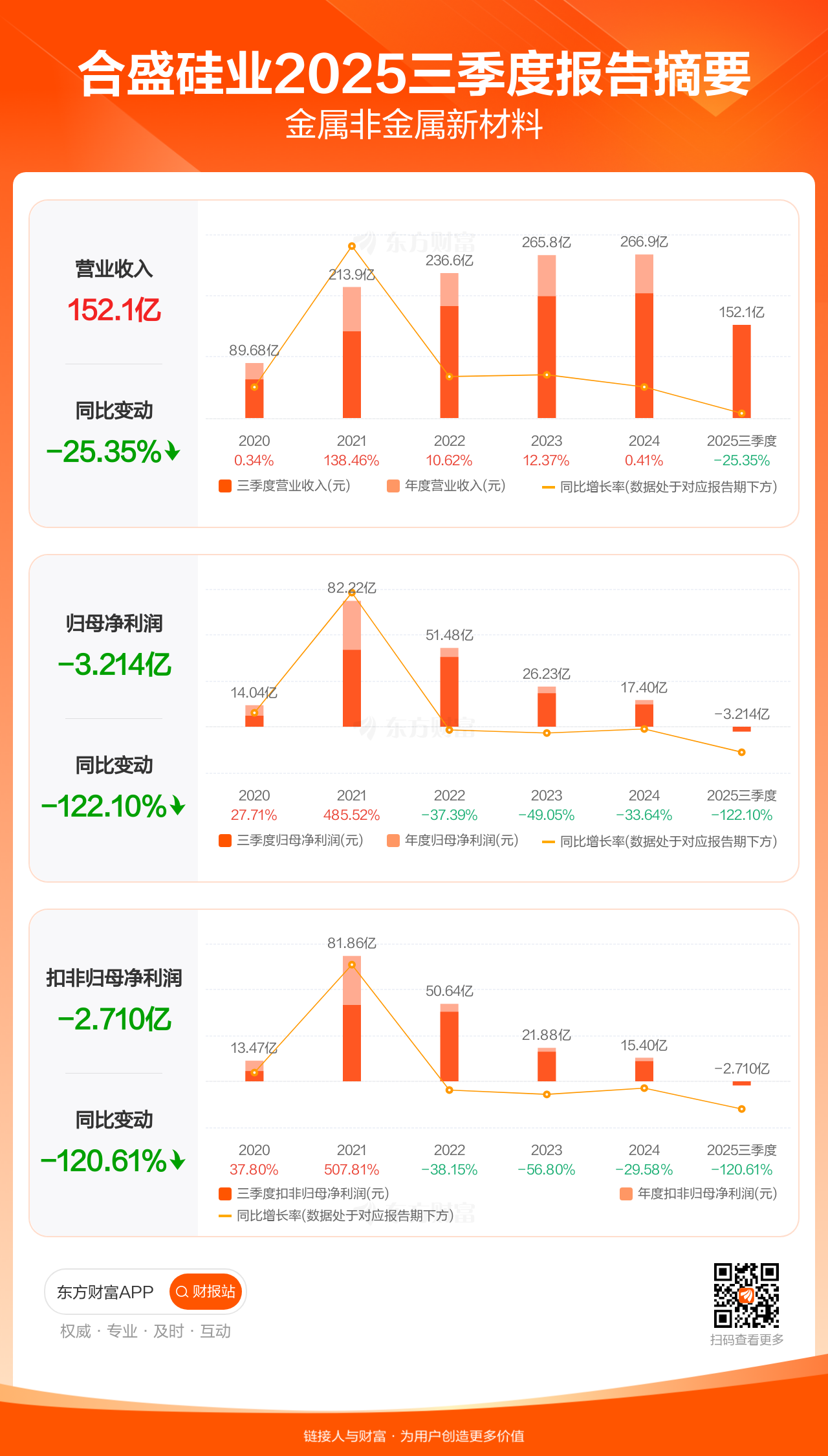 合盛硅业10月30日发布2025年三季报显示,公司前三季实现营业收入152.06亿元,同比下滑25.35%;归母净利润-3.21亿元;扣非归母净利润-2.71亿元。