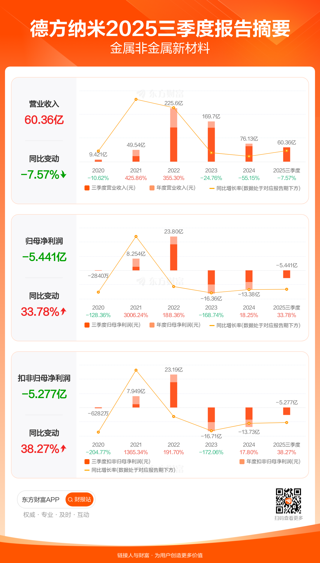德方纳米10月30日发布2025年三季报显示,公司前三季实现营业收入60.36亿元,同比下滑7.57%;归母净利润-5.44亿元;扣非归母净利润-5.28亿元。