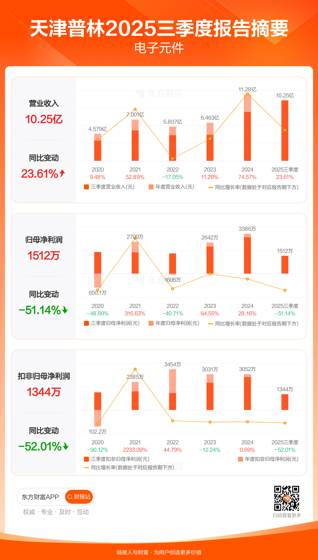 天津普林10月30日发布2025年三季报显示,公司前三季实现营业收入10.25亿元,同比增长23.61%;归母净利润1511.73万元,同比下滑51.14%;扣非归母净利润1344.04万元,同比下滑52.01%。