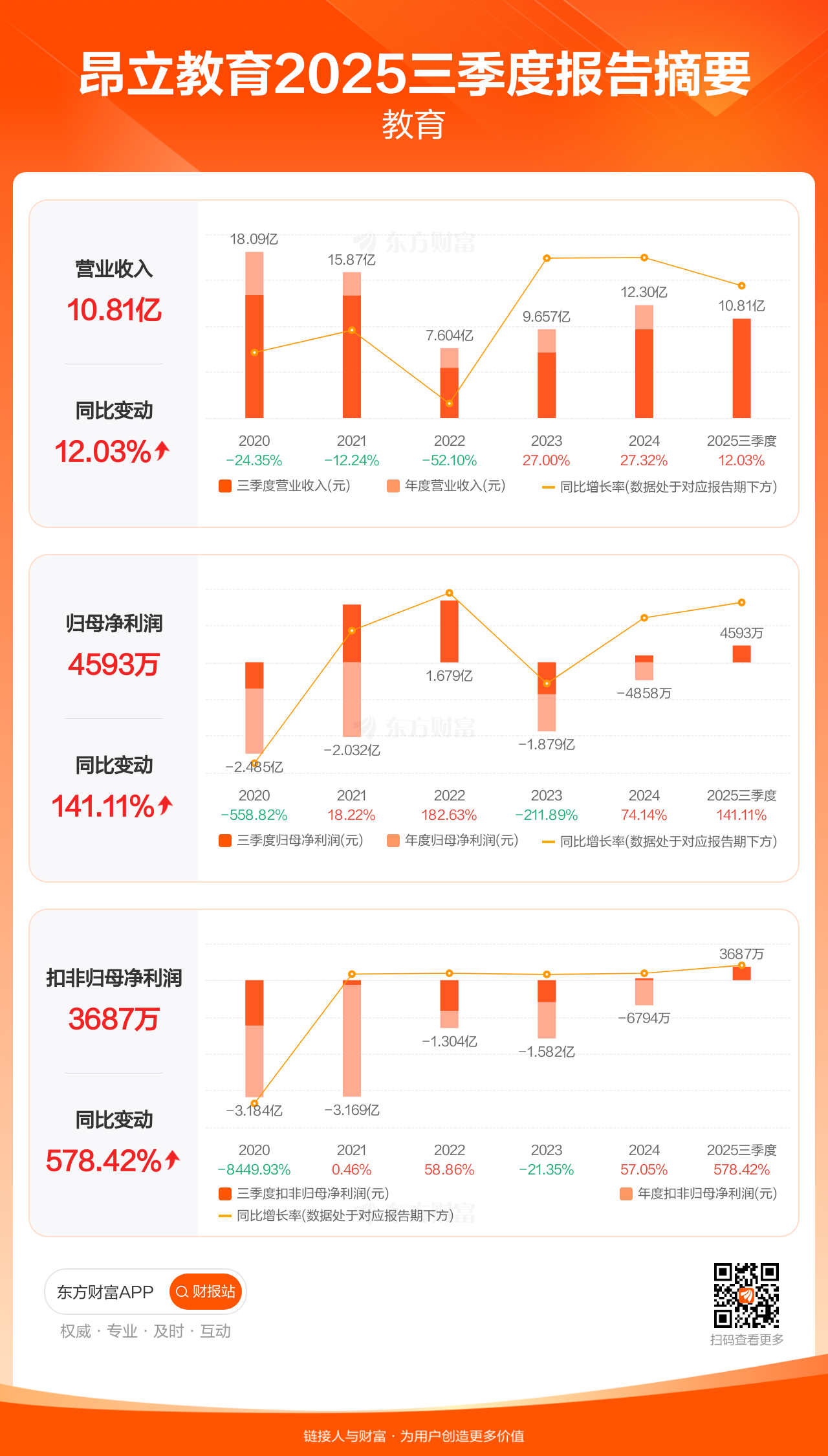 昂立教育10月30日发布2025年三季报显示,公司前三季实现营业收入10.81亿元,同比增长12.03%;归母净利润4593.09万元,同比增长141.11%;扣非归母净利润3686.94万元,同比增长578.42%。