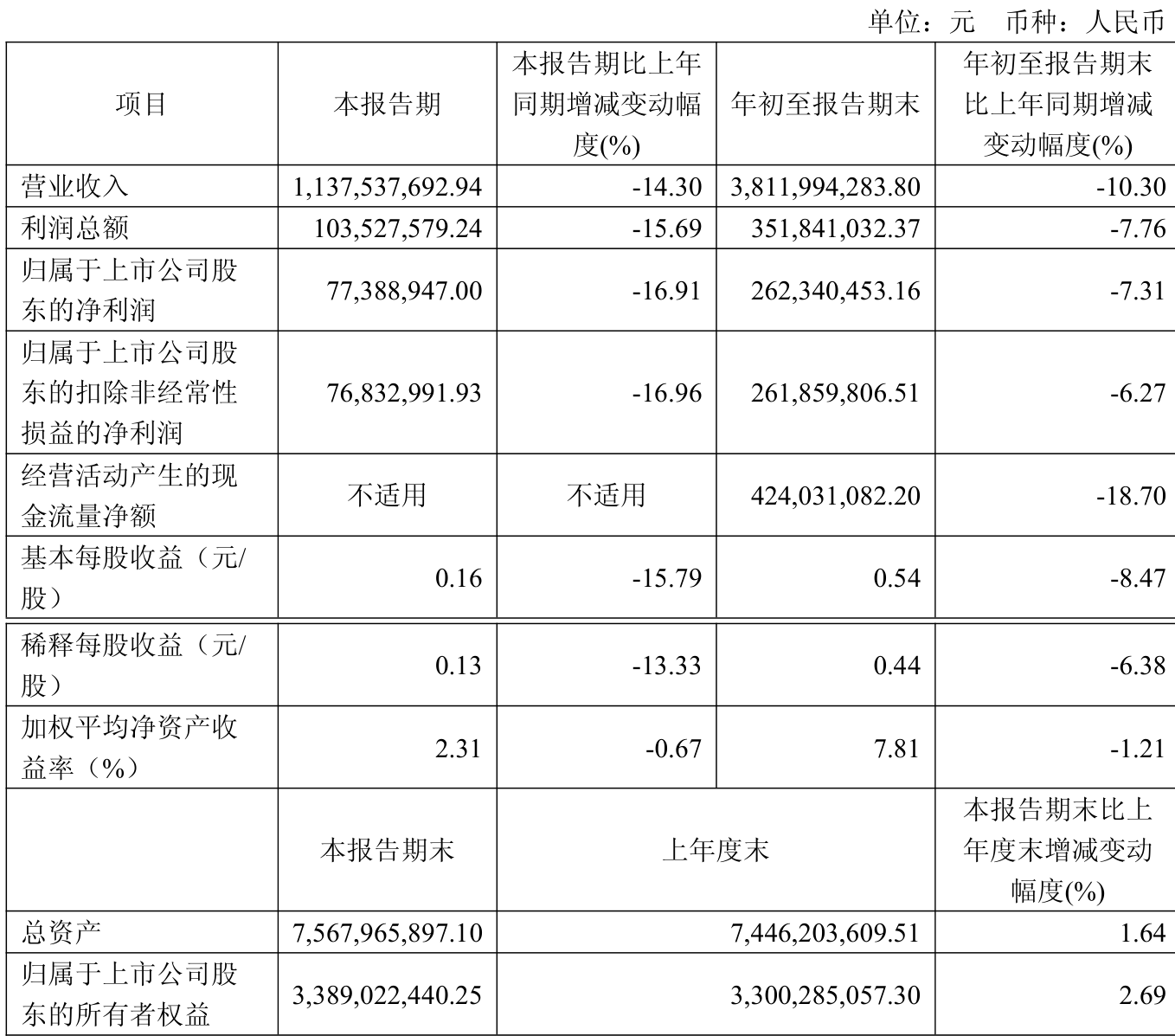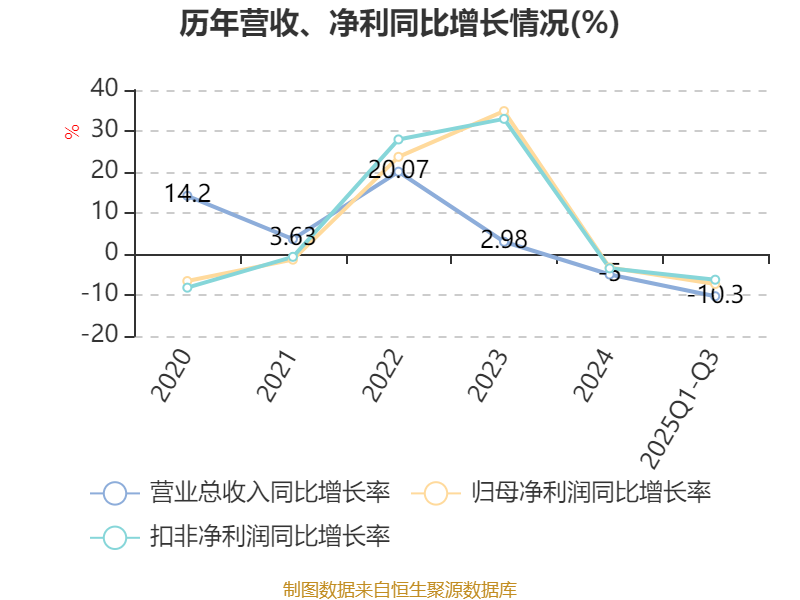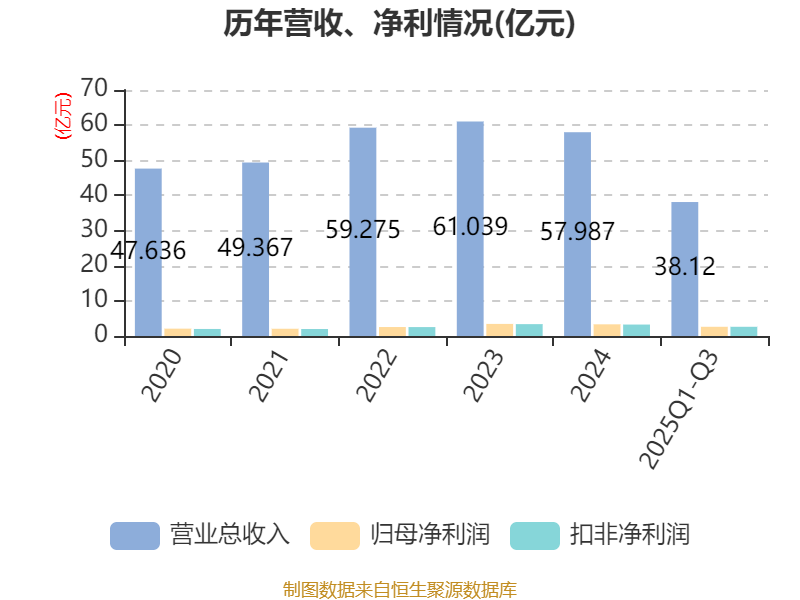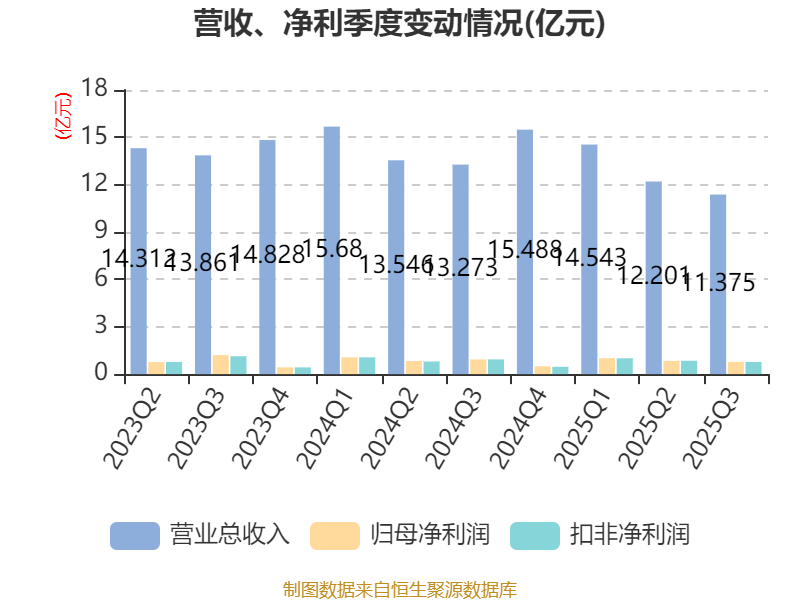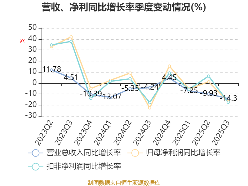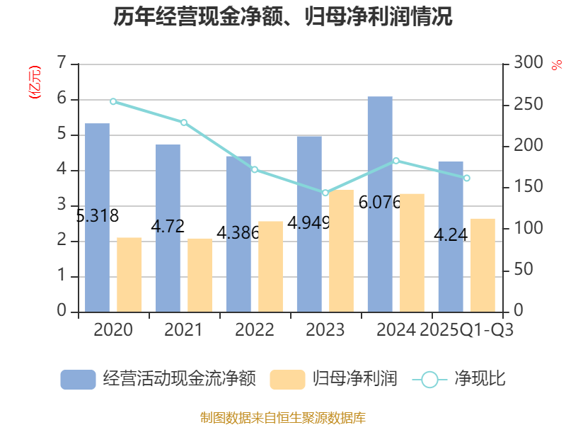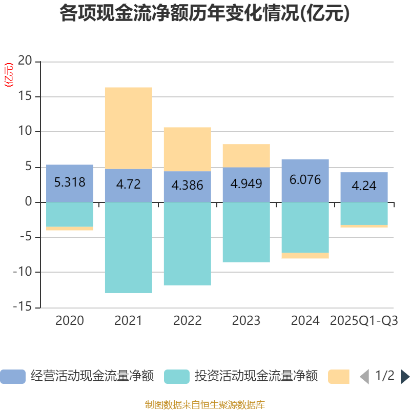 2025年前三季度,公司经营活动现金流净额为4.24亿元,同比下降18.7%;筹资活动现金流净额-3580.93万元,同比增加5474.93万元;投资活动现金流净额-3.26亿元,上年同期为-3.09亿元。