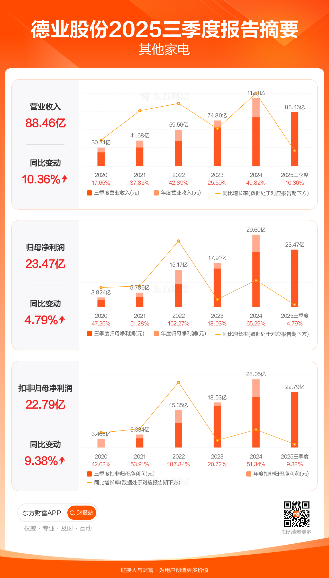 德业股份10月30日发布2025年三季报显示,公司前三季实现营业收入88.46亿元,同比增长10.36%;归母净利润23.47亿元,同比增长4.79%;扣非归母净利润22.79亿元,同比增长9.38%。