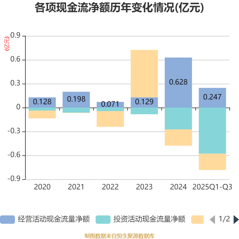 2025年前三季度,公司经营活动现金流净额为2474.69万元,同比下降3.14%;筹资活动现金流净额-2050.5万元,同比减少105.46万元;投资活动现金流净额-5792.19万元,上年同期为-2706.04万元。
