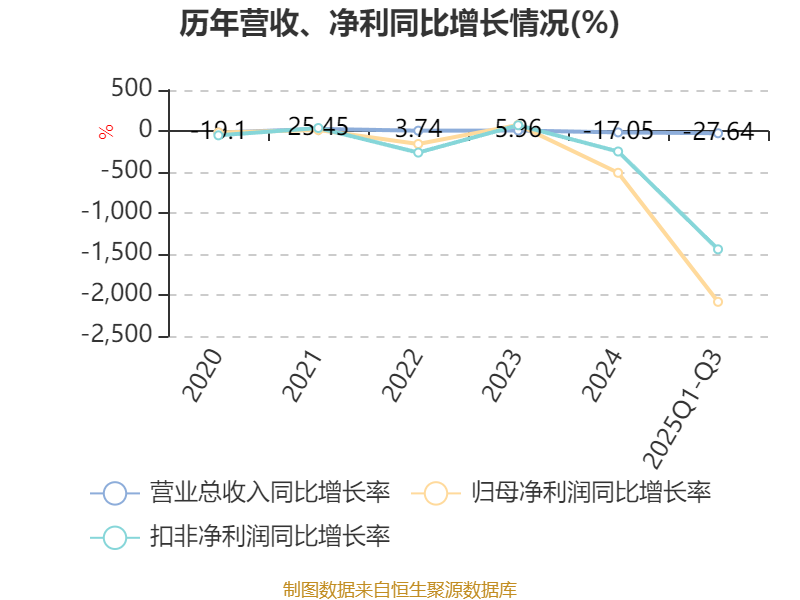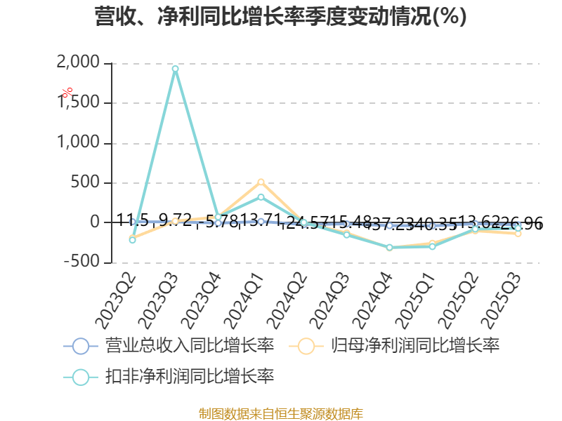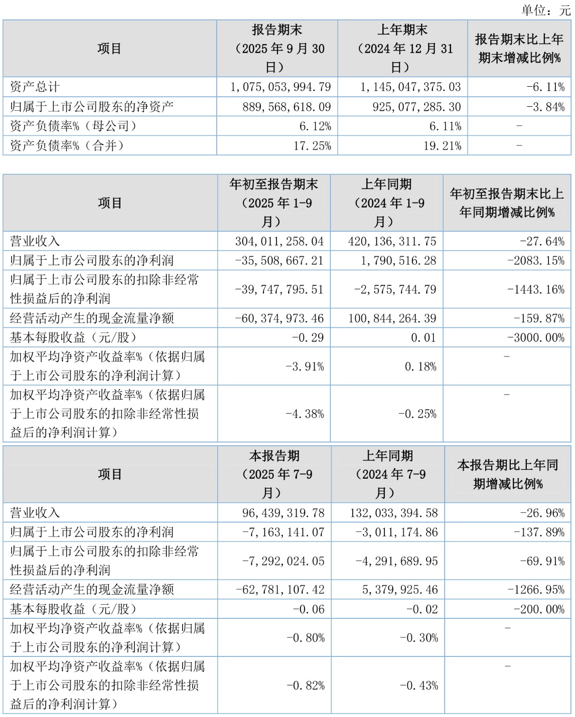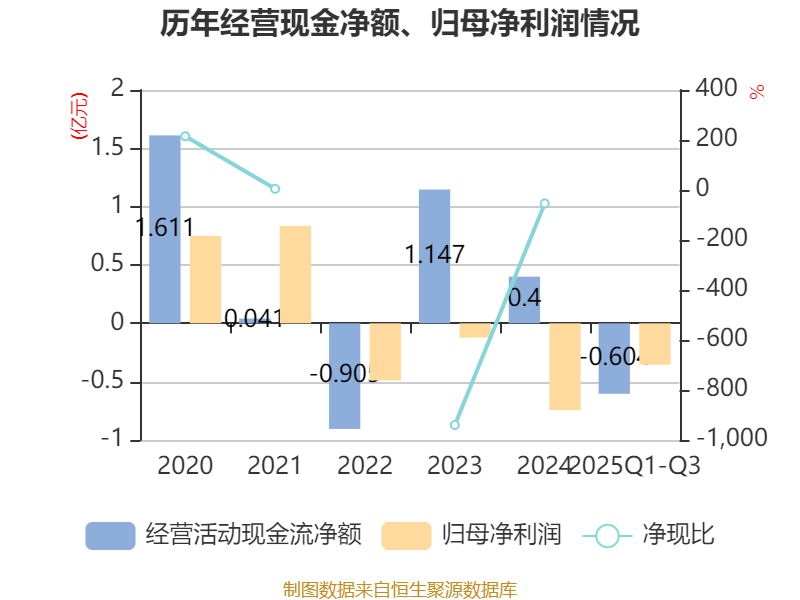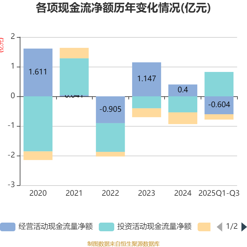 2025年前三季度,公司经营活动现金流净额为-6037.5万元,同比减少1.61亿元;筹资活动现金流净额-1799.95万元,同比减少43.65万元;投资活动现金流净额8227.02万元,上年同期为-1120.08万元。