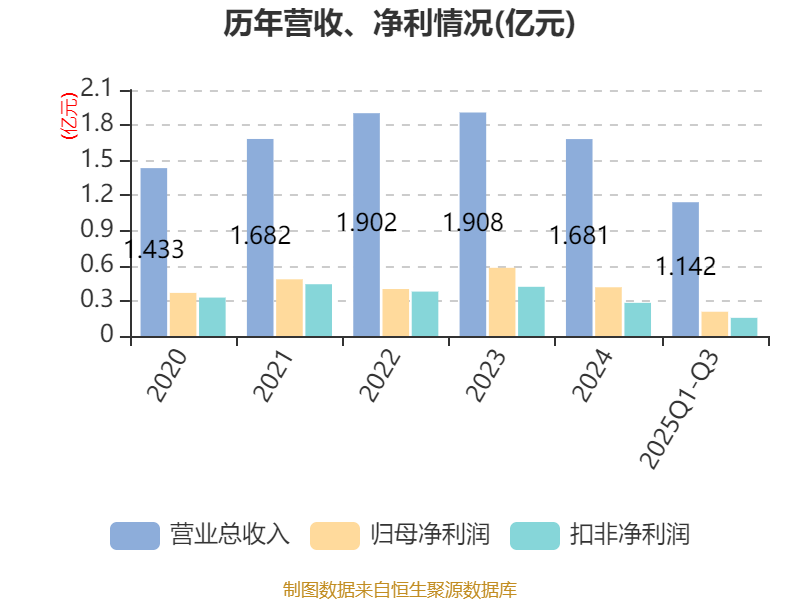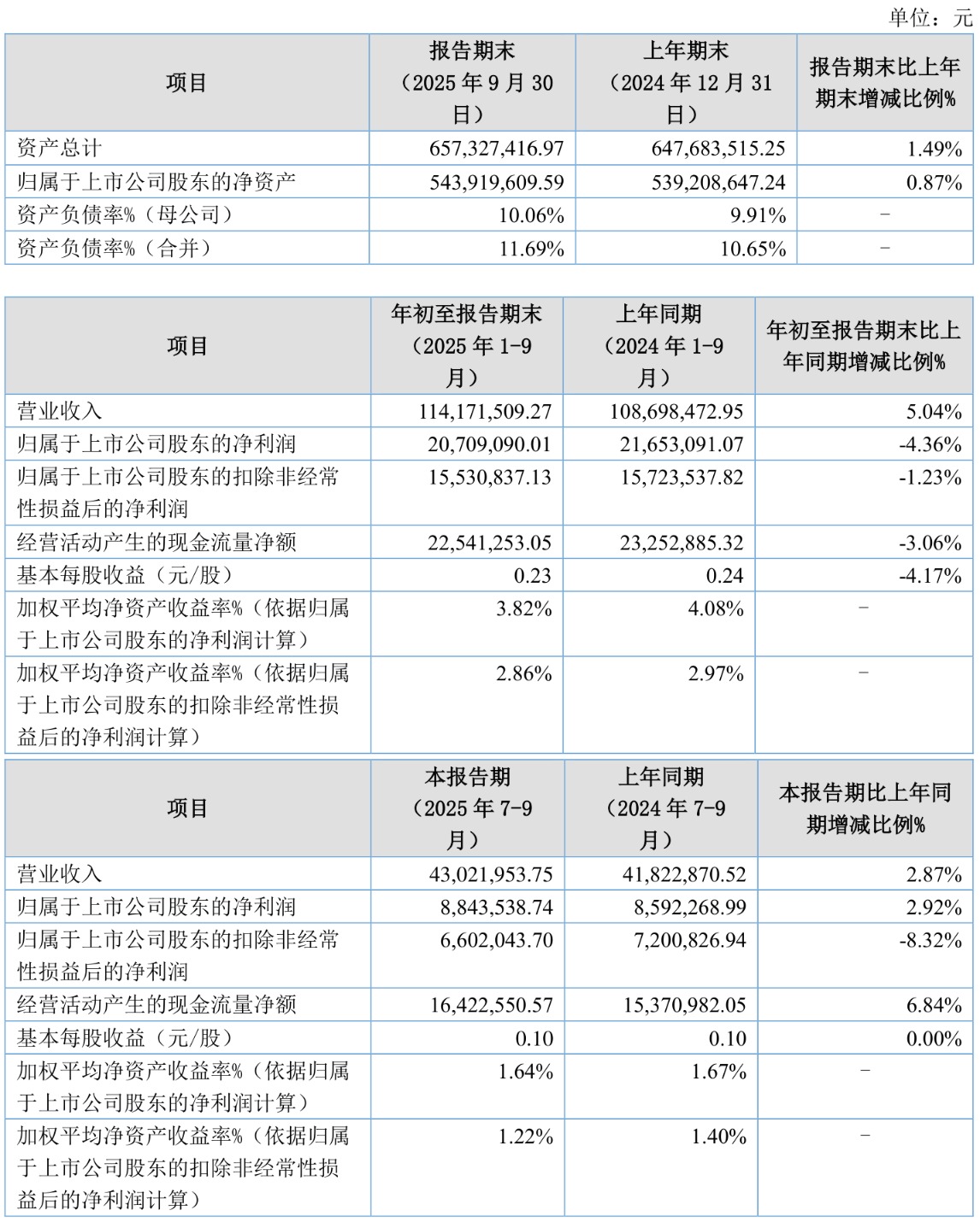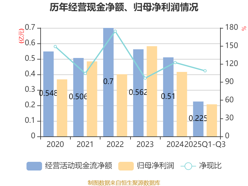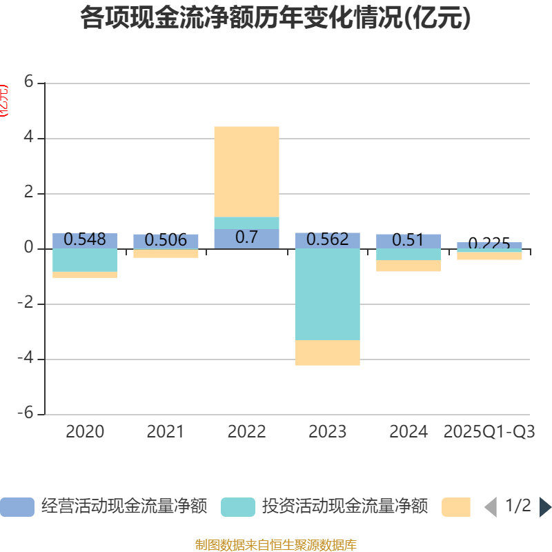 2025年前三季度,公司经营活动现金流净额为2254.13万元,同比下降3.06%;筹资活动现金流净额-2713.85万元,同比增加1105.59万元;投资活动现金流净额-1398.05万元,上年同期为4437.06万元。