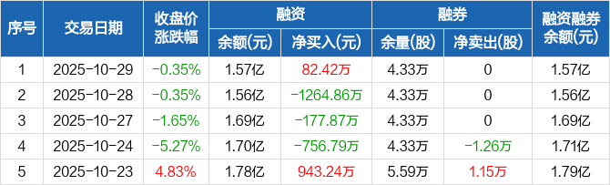 融资方面,当日融资买入718.07万元,融资偿还635.65万元,融资净买入82.42万元。融券方面,融券卖出0股,融券偿还0股,融券余量4.33万股,融券余额48.67万元。融资融券余额合计1.57亿元。
