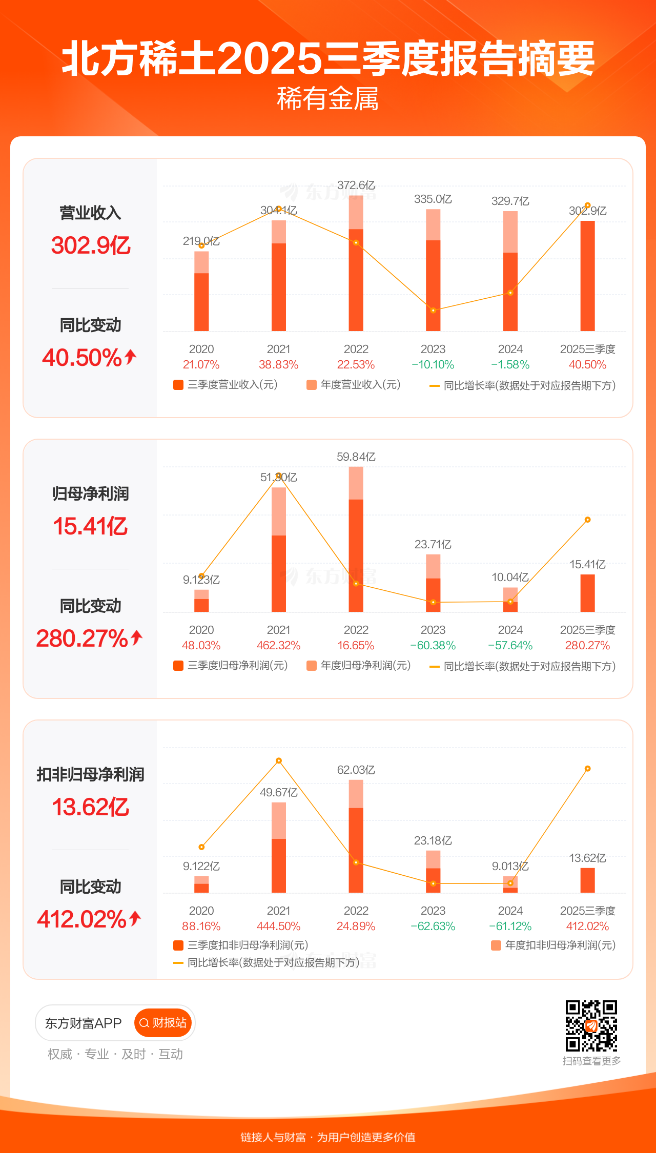 北方稀土10月28日发布2025年三季报显示,公司前三季实现营业收入302.92亿元,同比增长40.50%;归母净利润15.41亿元,同比增长280.27%;扣非归母净利润13.62亿元,同比增长412.02%。