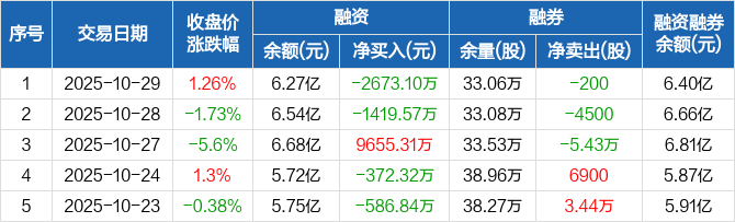 融资方面,当日融资买入1.41亿元,融资偿还1.67亿元,融资净偿还2673.1万元。融券方面,融券卖出1.38万股,融券偿还1.4万股,融券余量33.06万股,融券余额1253.64万元。融资融券余额合计6.4亿元。