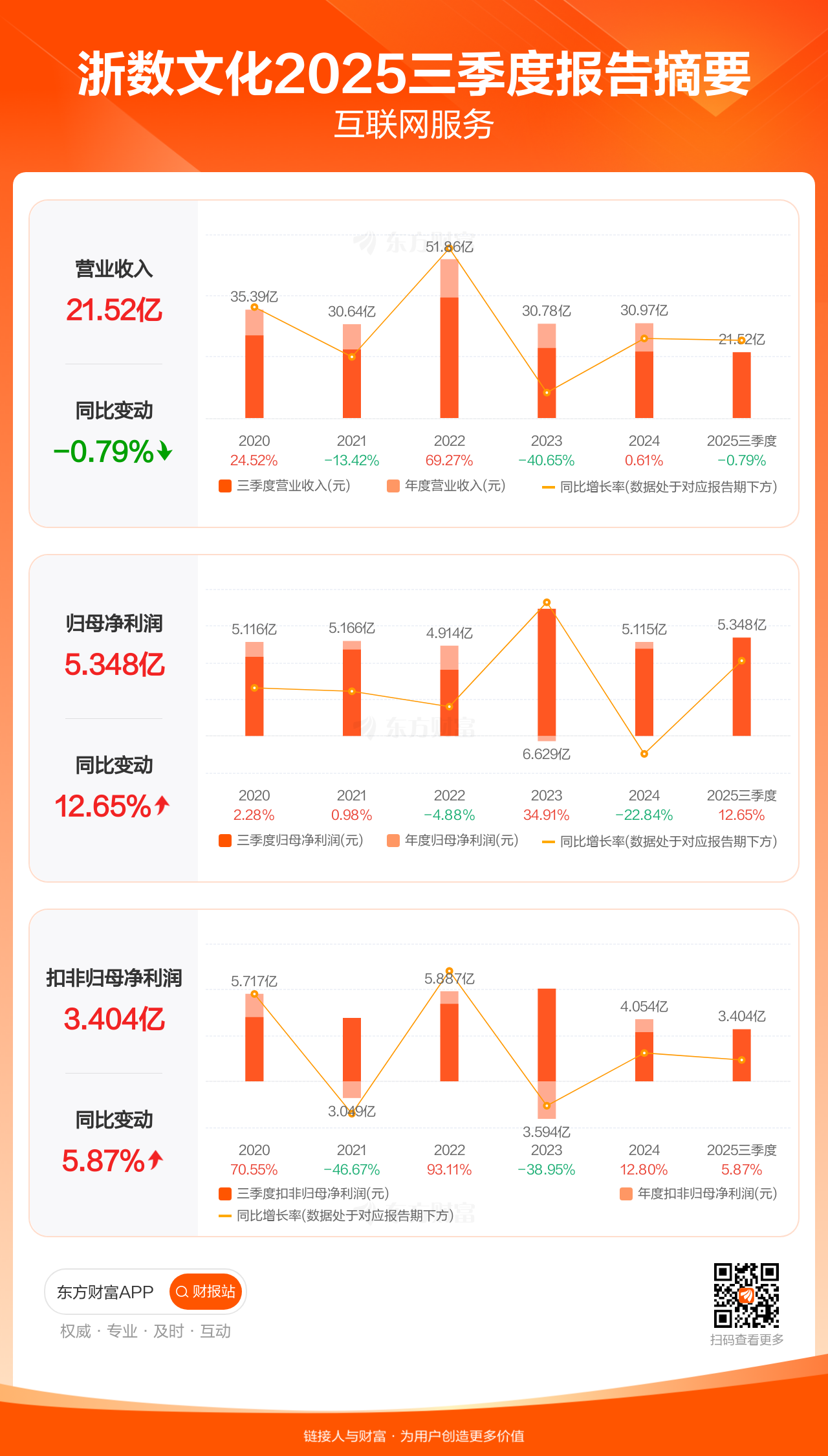 浙数文化10月28日发布2025年三季报显示,公司前三季实现营业收入21.52亿元,同比下滑0.79%;归母净利润5.35亿元,同比增长12.65%;扣非归母净利润3.40亿元,同比增长5.87%。