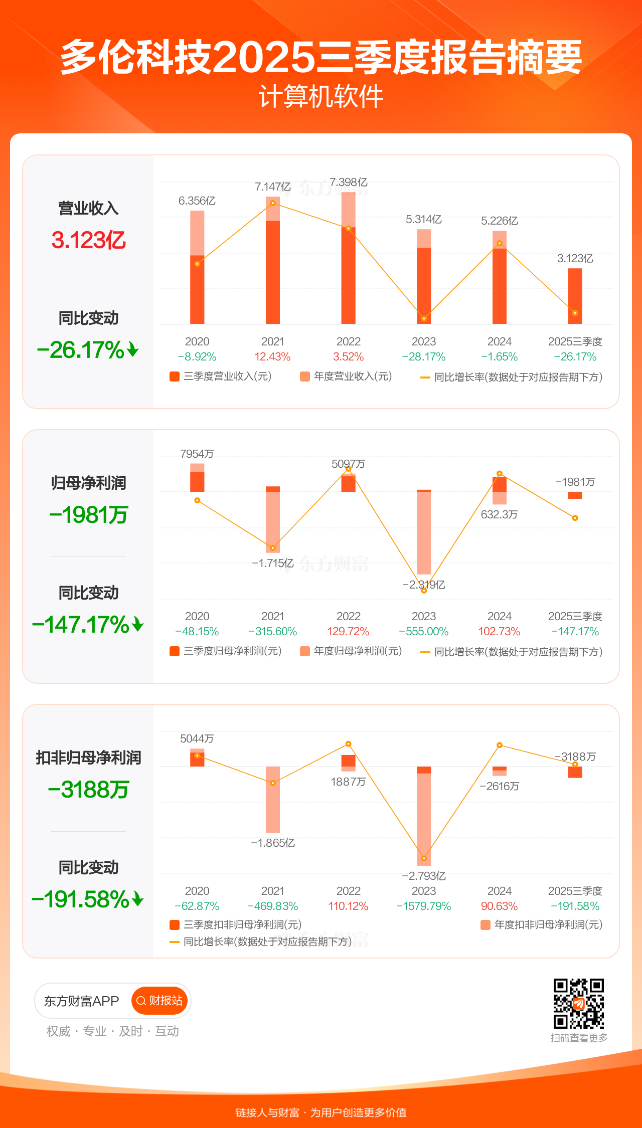 多伦科技10月31日发布2025年三季报显示,公司前三季实现营业收入3.12亿元,同比下滑26.17%;归母净利润-1980.83万元;扣非归母净利润-3188.24万元。