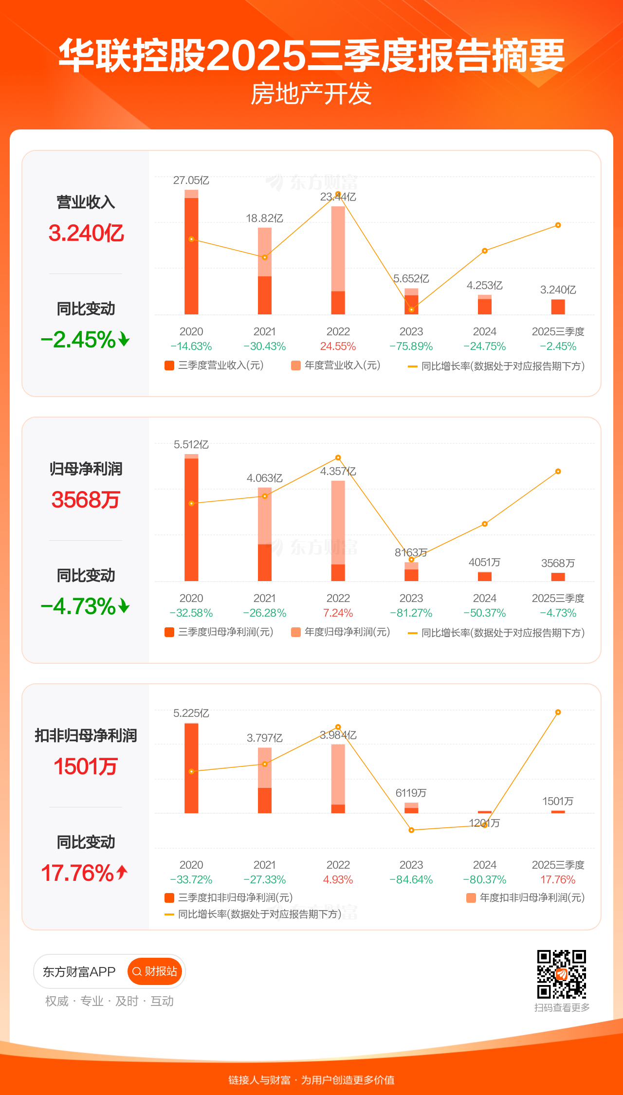 华联控股10月31日发布2025年三季报显示,公司前三季实现营业收入3.24亿元,同比下滑2.45%;归母净利润3568.39万元,同比下滑4.73%;扣非归母净利润1501.23万元,同比增长17.76%。