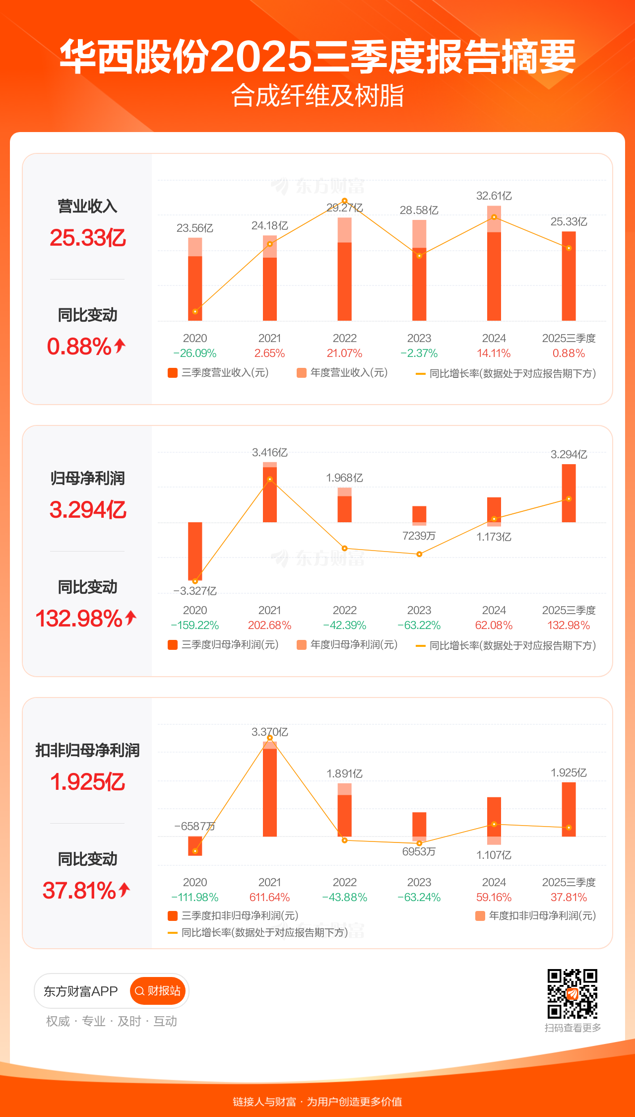 华西股份10月31日发布2025年三季报显示,公司前三季实现营业收入25.33亿元,同比增长0.88%;归母净利润3.29亿元,同比增长132.98%;扣非归母净利润1.93亿元,同比增长37.81%。