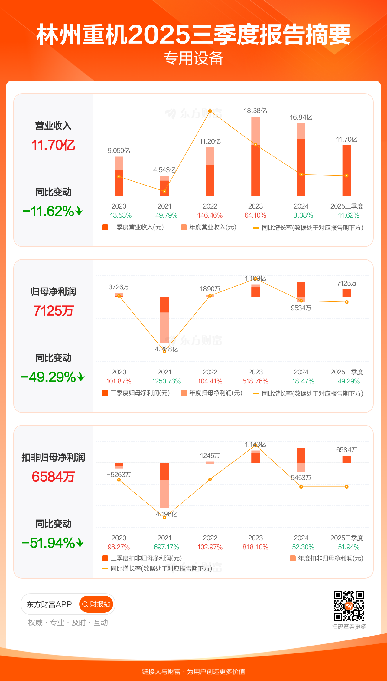 林州重机10月31日发布2025年三季报显示,公司前三季实现营业收入11.70亿元,同比下滑11.62%;归母净利润7124.89万元,同比下滑49.29%;扣非归母净利润6583.73万元,同比下滑51.94%。