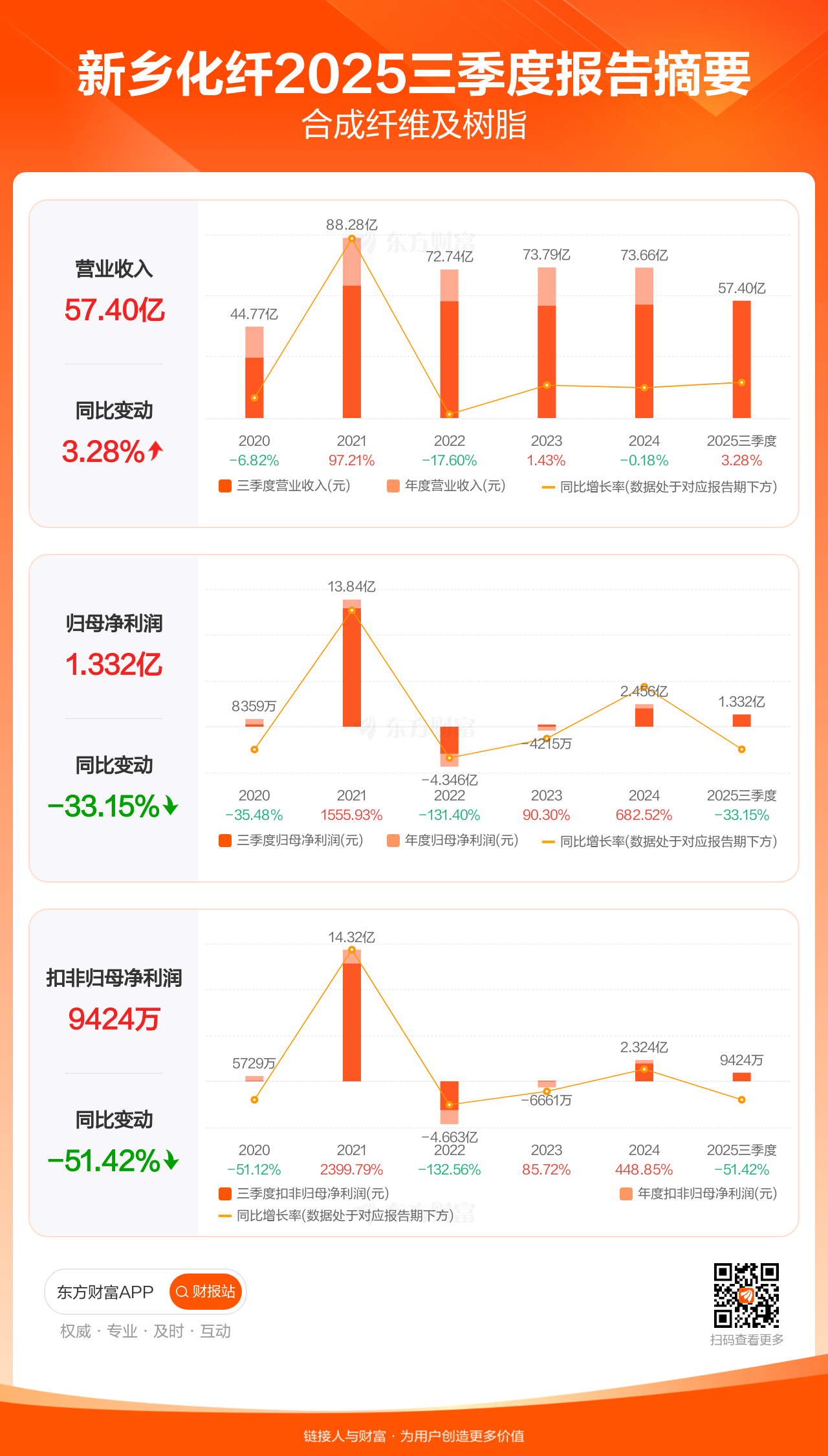 新乡化纤10月31日发布2025年三季报显示,公司前三季实现营业收入57.40亿元,同比增长3.28%;归母净利润1.33亿元,同比下滑33.15%;扣非归母净利润9424.50万元,同比下滑51.42%。