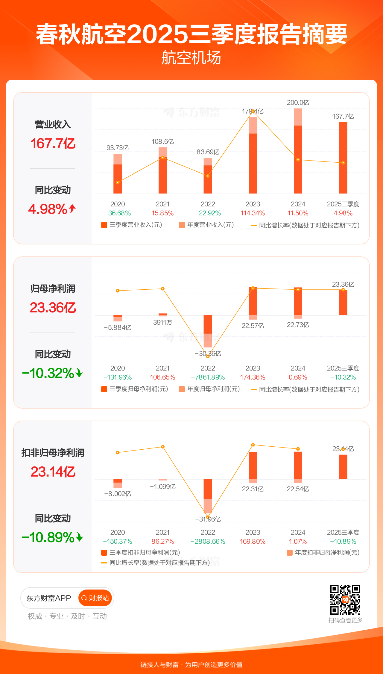 春秋航空10月31日发布2025年三季报显示,公司前三季实现营业收入167.73亿元,同比增长4.98%;归母净利润23.36亿元,同比下滑10.32%;扣非归母净利润23.14亿元,同比下滑10.89%。