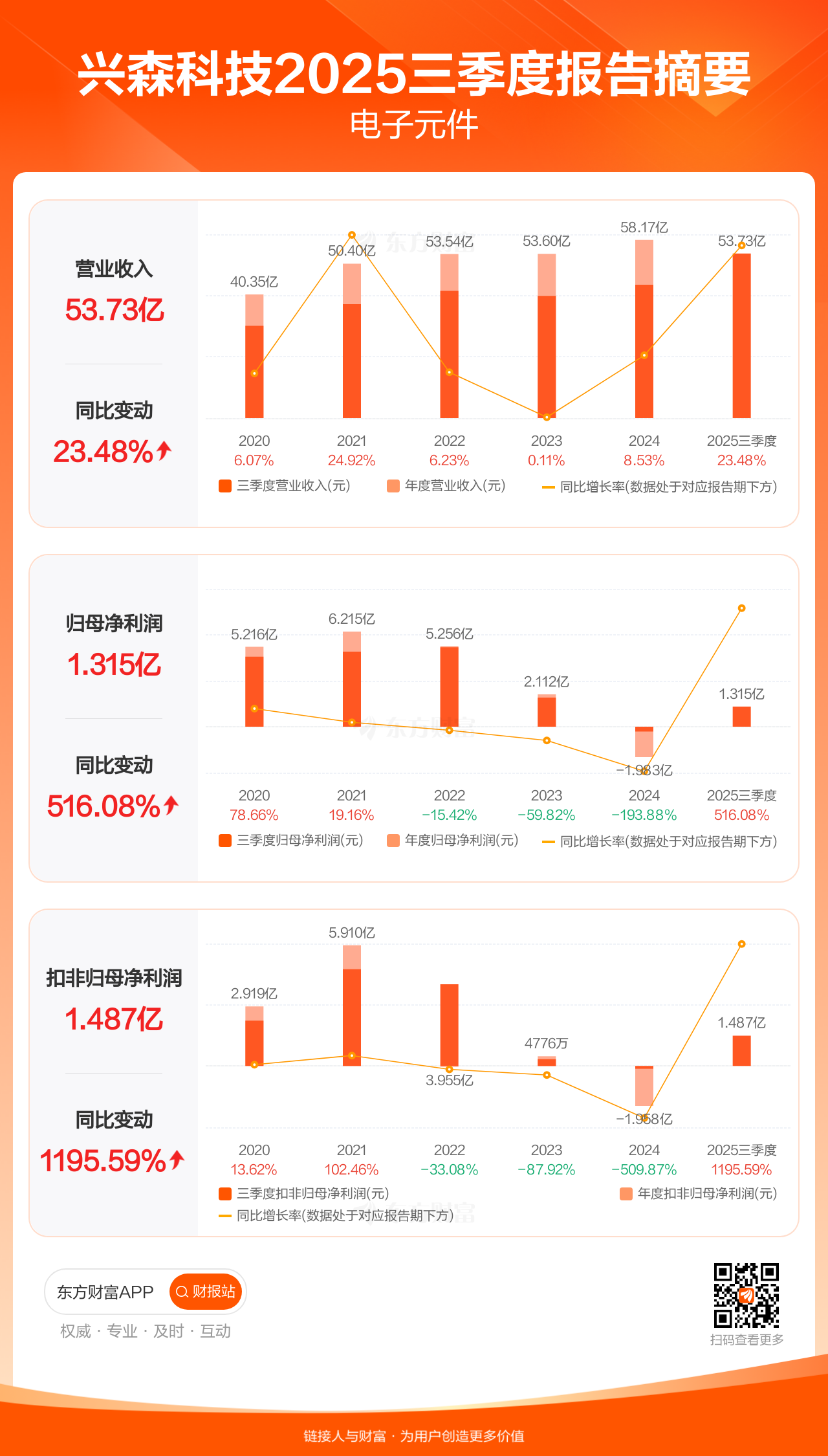 兴森科技10月31日发布2025年三季报显示,公司前三季实现营业收入53.73亿元,同比增长23.48%;归母净利润1.31亿元,同比增长516.08%;扣非归母净利润1.49亿元,同比增长1195.59%。