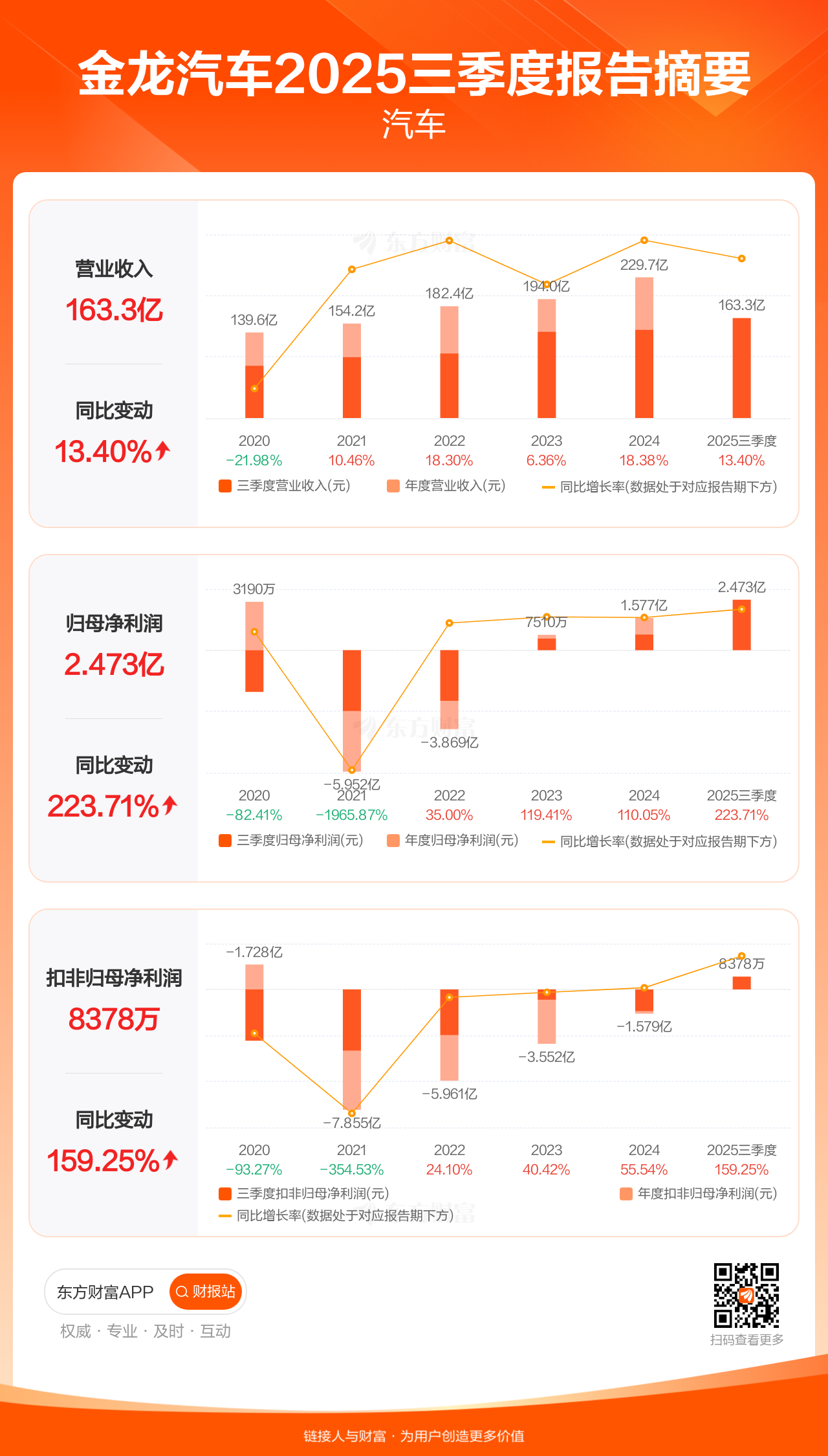 金龙汽车10月31日发布2025年三季报显示,公司前三季实现营业收入163.29亿元,同比增长13.40%;归母净利润2.47亿元,同比增长223.71%;扣非归母净利润8378.39万元,同比增长159.25%。