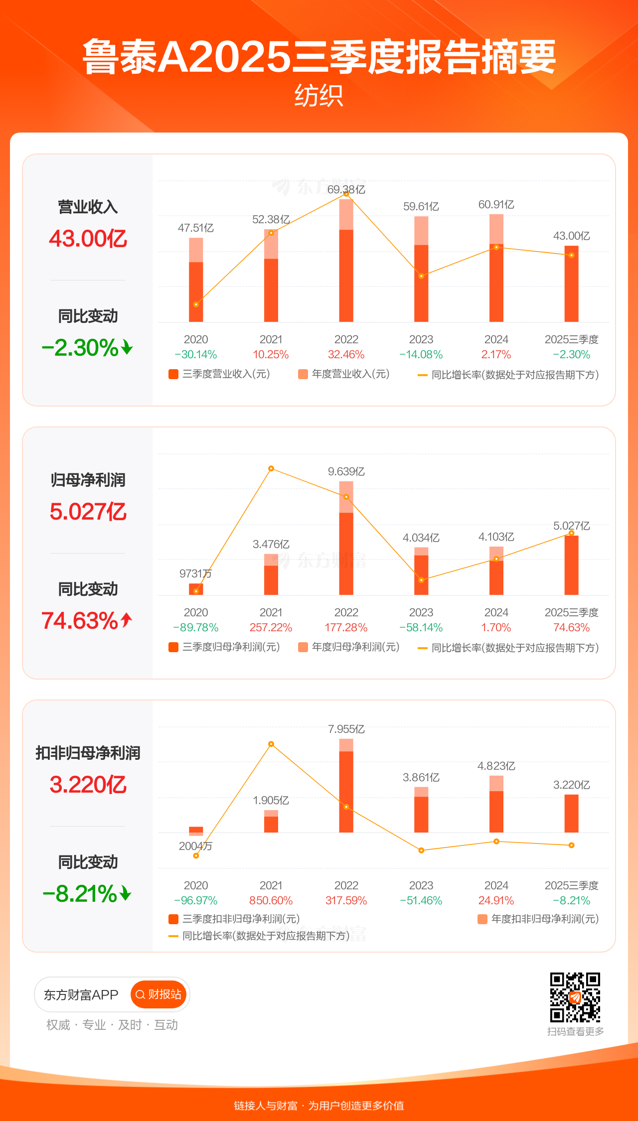 鲁泰A10月31日发布2025年三季报显示,公司前三季实现营业收入43.00亿元,同比下滑2.30%;归母净利润5.03亿元,同比增长74.63%;扣非归母净利润3.22亿元,同比下滑8.21%。