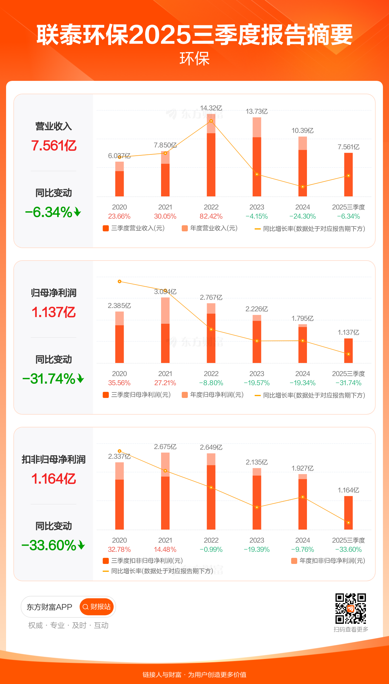 联泰环保10月31日发布2025年三季报显示,公司前三季实现营业收入7.56亿元,同比下滑6.34%;归母净利润1.14亿元,同比下滑31.74%;扣非归母净利润1.16亿元,同比下滑33.60%。