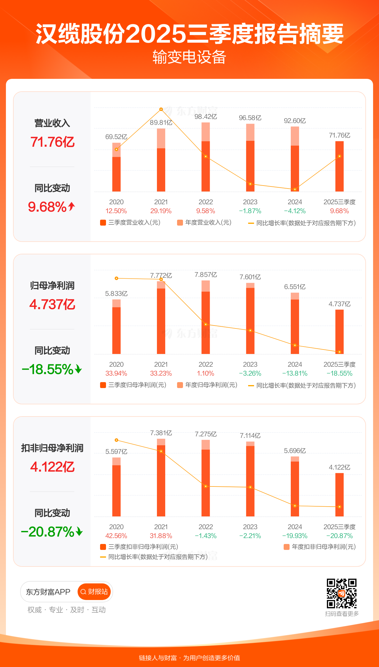 汉缆股份10月31日发布2025年三季报显示,公司前三季实现营业收入71.76亿元,同比增长9.68%;归母净利润4.74亿元,同比下滑18.55%;扣非归母净利润4.12亿元,同比下滑20.87%。