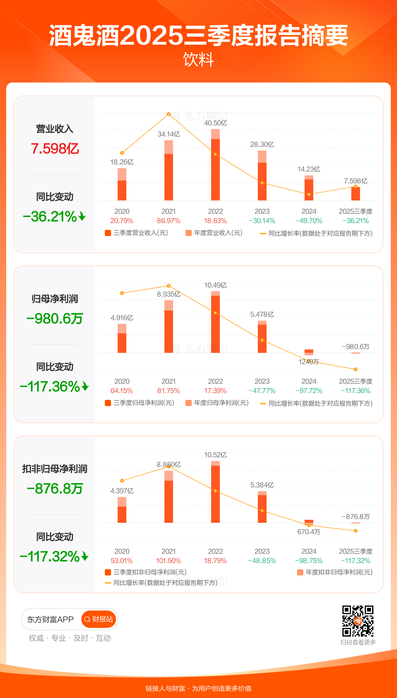 酒鬼酒10月31日发布2025年三季报显示,公司前三季实现营业收入7.60亿元,同比下滑36.21%;归母净利润-980.55万元;扣非归母净利润-876.77万元。