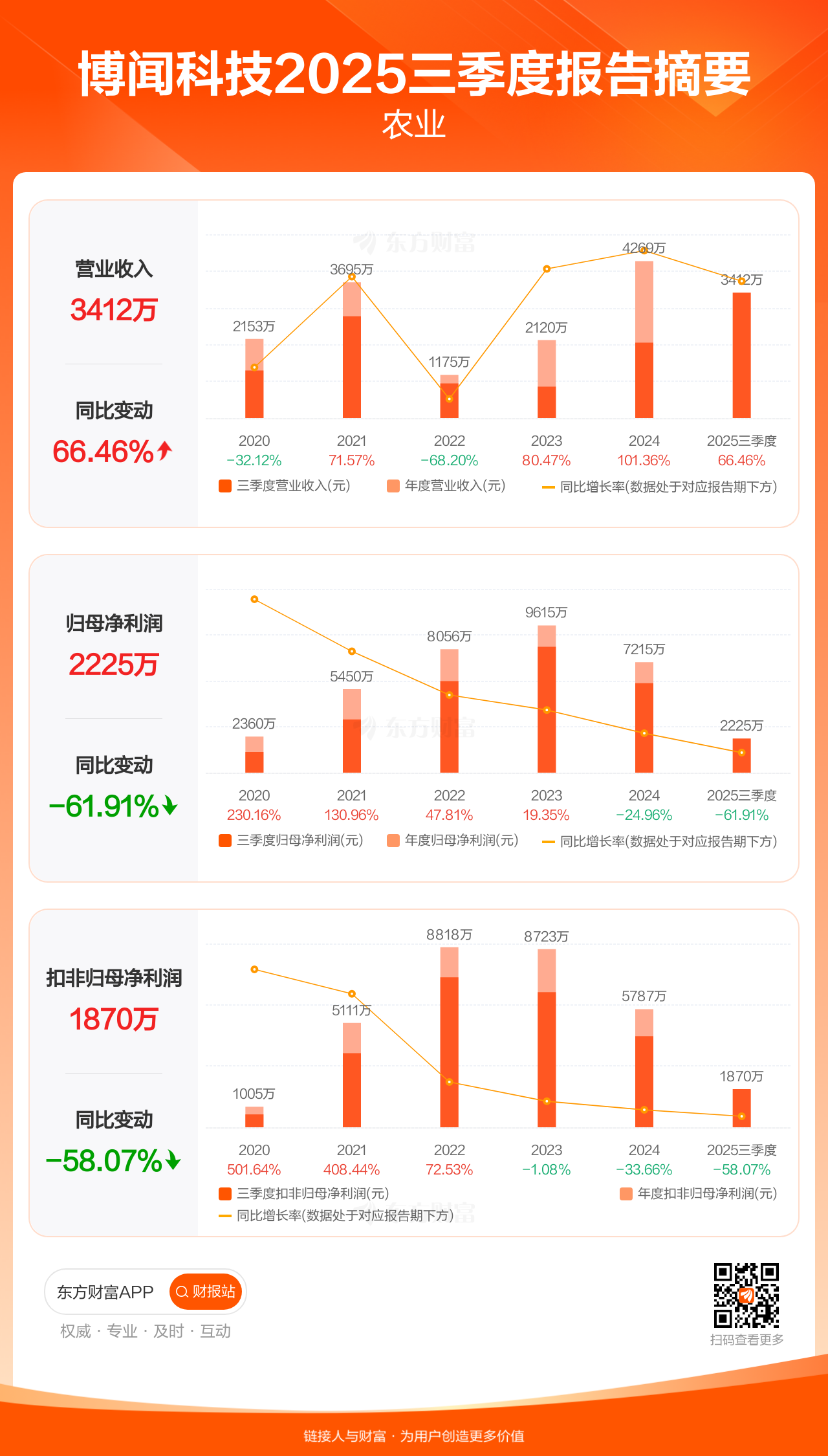 博闻科技10月31日发布2025年三季报显示,公司前三季实现营业收入3412.30万元,同比增长66.46%;归母净利润2225.11万元,同比下滑61.91%;扣非归母净利润1870.31万元,同比下滑58.07%。