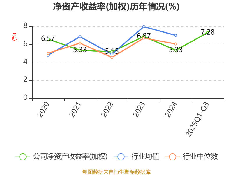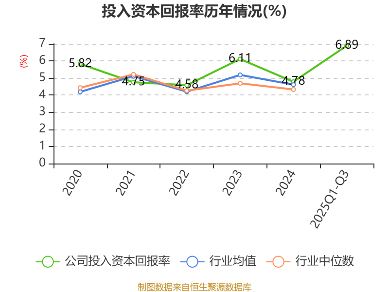 盈利能力方面, 2025年前三季度公司加权平均净资产收益率为7.28%,同比上升1.79个百分点。公司2025年前三季度投入资本回报率为6.89%,较上年同期上升1.96个百分点。