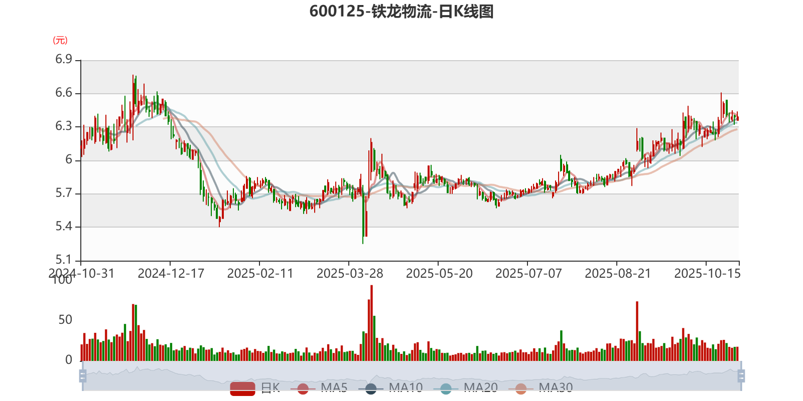 中证智能财讯铁龙物流(600125)10月31日披露2025年第三季度报告。前三季度公司实现营业总收入85.82亿元,同比下降15.22%;归母净利润5.48亿元,同比增长38.57%;扣非净利润5.4亿元,同比增长40.49%;经营活动产生的现金流量净额为6.44亿元,同比增长47.25%;报告期内,铁龙物流基本每股收益为0.419元,加权平均净资产收益率为7.28%。