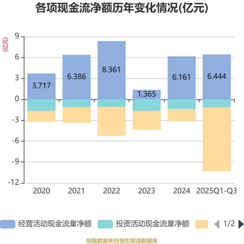 2025年前三季度,公司经营活动现金流净额为6.44亿元,同比增长47.25%;筹资活动现金流净额-9.16亿元,同比减少7.46亿元;投资活动现金流净额-1.15亿元,上年同期为-1.07亿元。