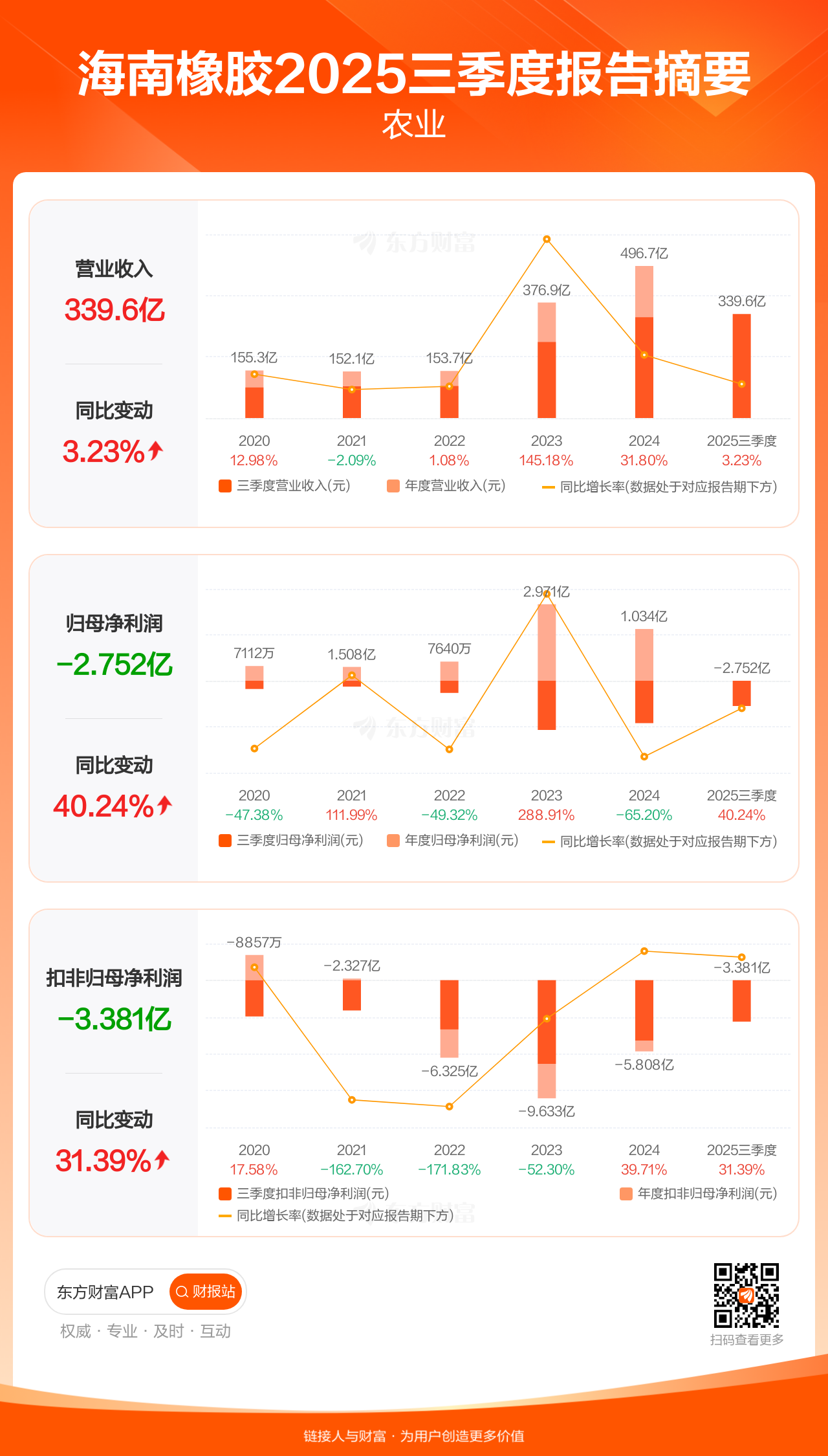 海南橡胶10月31日发布2025年三季报显示,公司前三季实现营业收入339.64亿元,同比增长3.23%;归母净利润-2.75亿元;扣非归母净利润-3.38亿元。