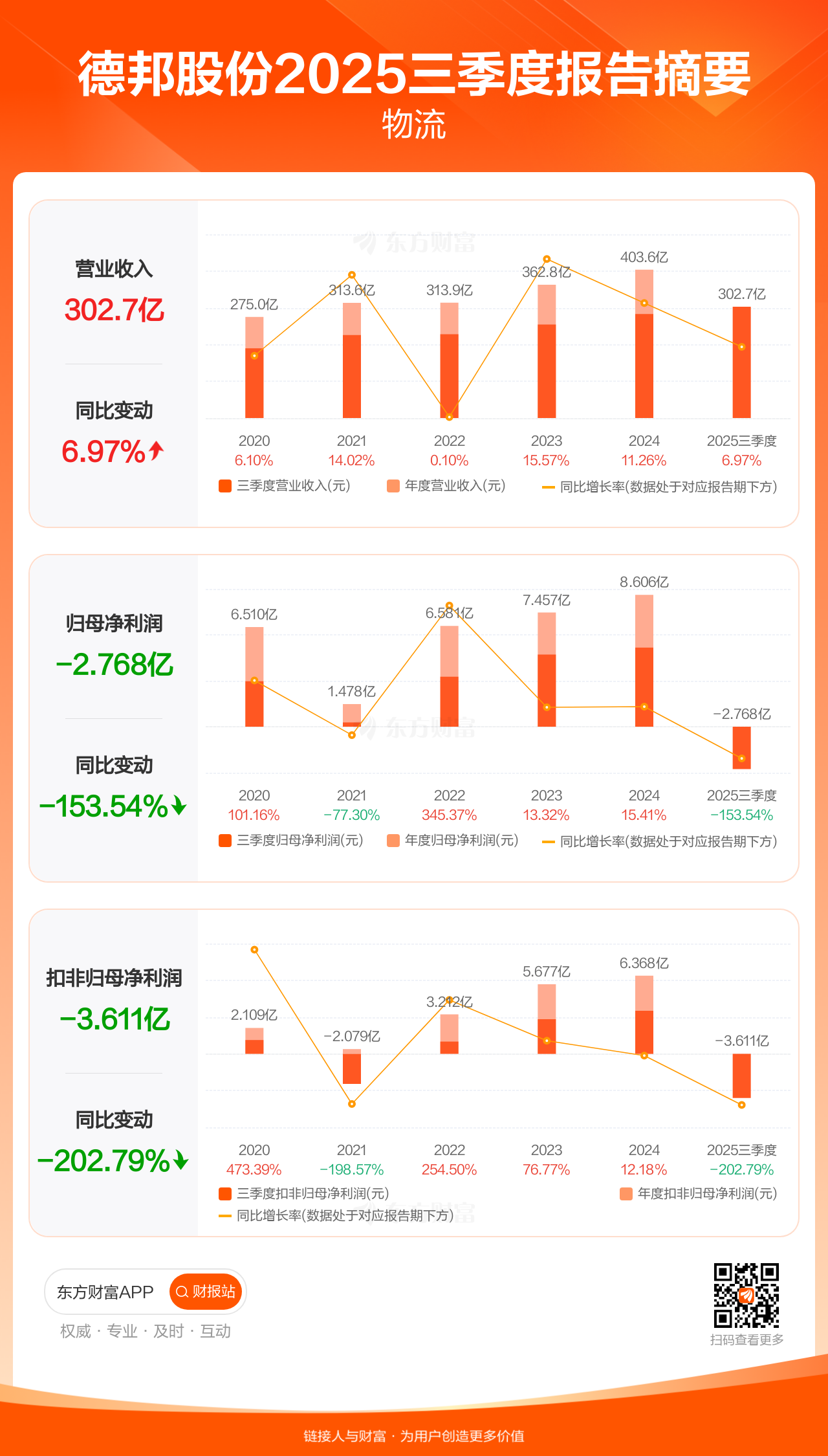 德邦股份10月31日发布2025年三季报显示,公司前三季实现营业收入302.70亿元,同比增长6.97%;归母净利润-2.77亿元;扣非归母净利润-3.61亿元。
