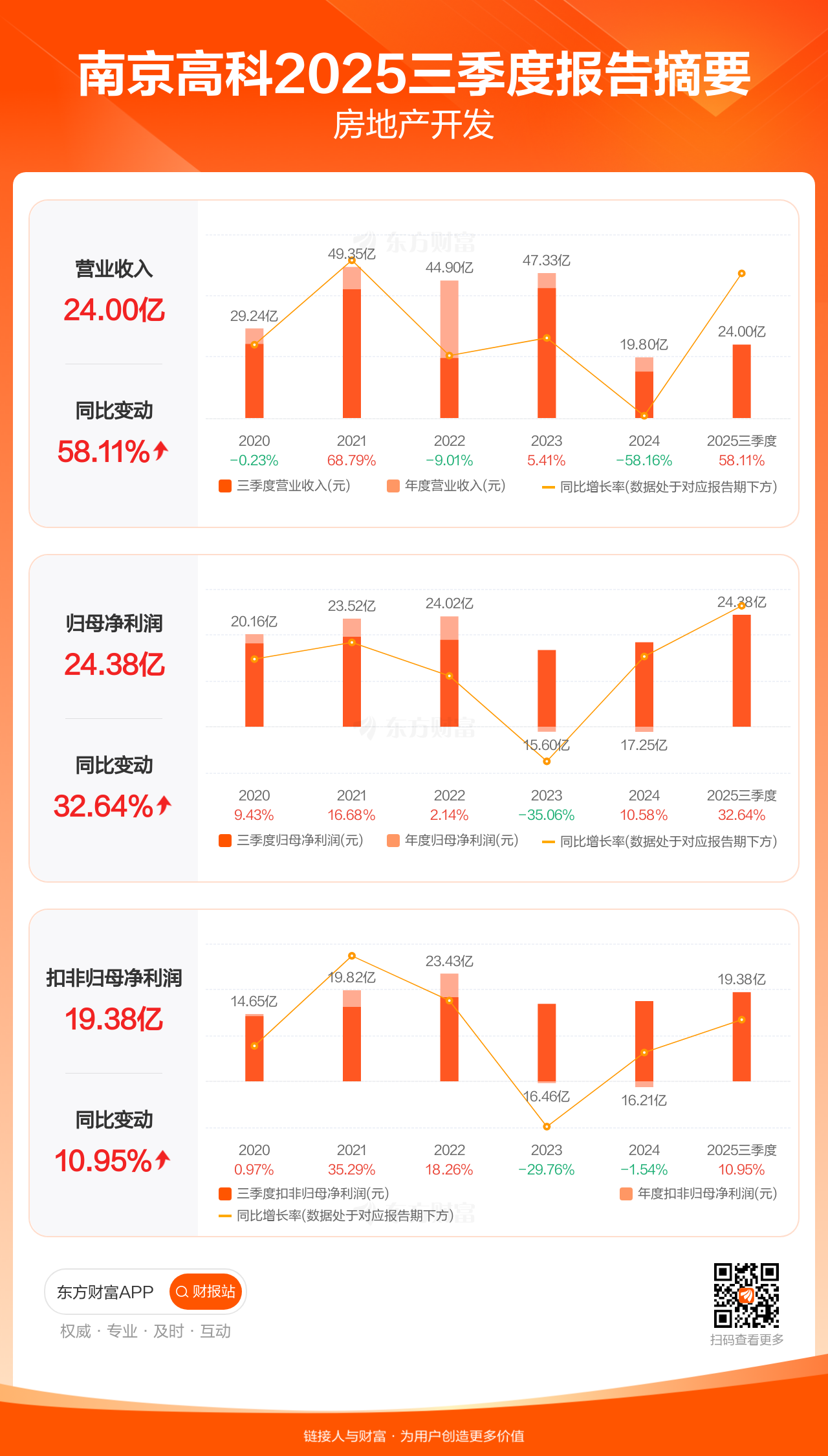 南京高科10月31日发布2025年三季报显示,公司前三季实现营业收入24.00亿元,同比增长58.11%;归母净利润24.38亿元,同比增长32.64%;扣非归母净利润19.38亿元,同比增长10.95%。