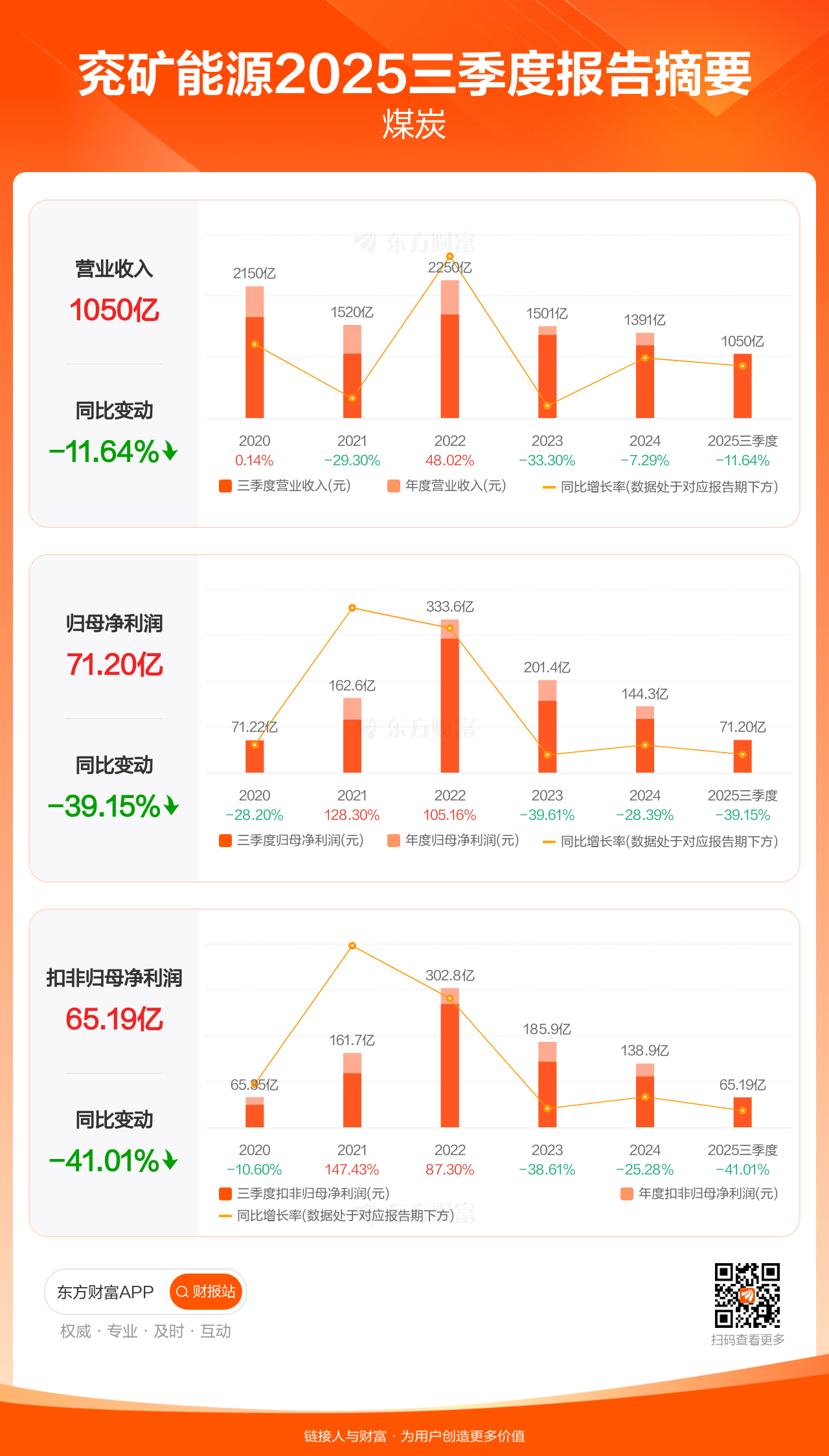 兖矿能源10月31日发布2025年三季报显示,公司前三季实现营业收入1049.57亿元,同比下滑11.64%;归母净利润71.20亿元,同比下滑39.15%;扣非归母净利润65.19亿元,同比下滑41.01%。