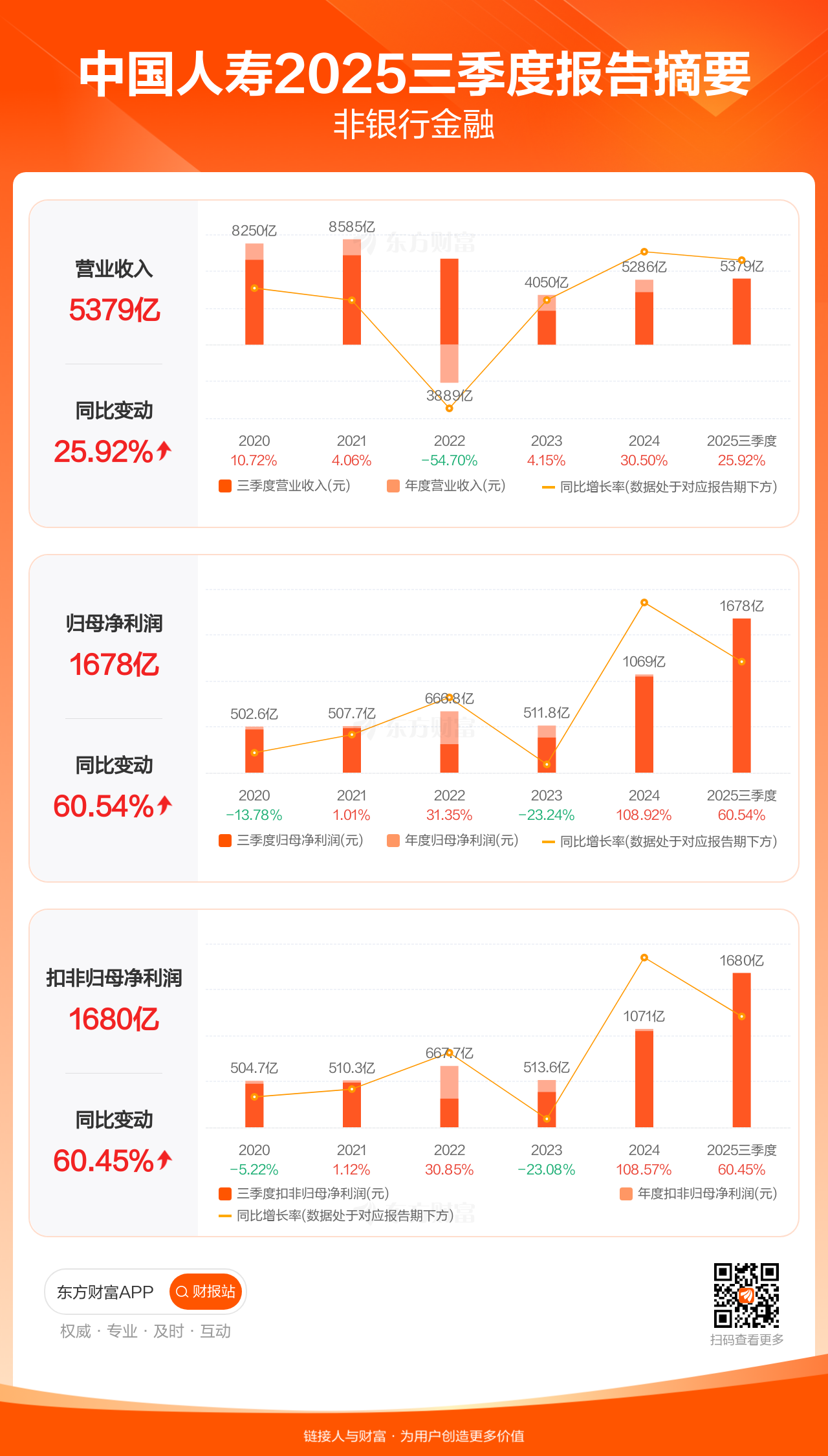 中国人寿10月31日发布2025年三季报显示,公司前三季实现营业收入5378.95亿元,同比增长25.92%;归母净利润1678.04亿元,同比增长60.54%;扣非归母净利润1679.53亿元,同比增长60.45%。