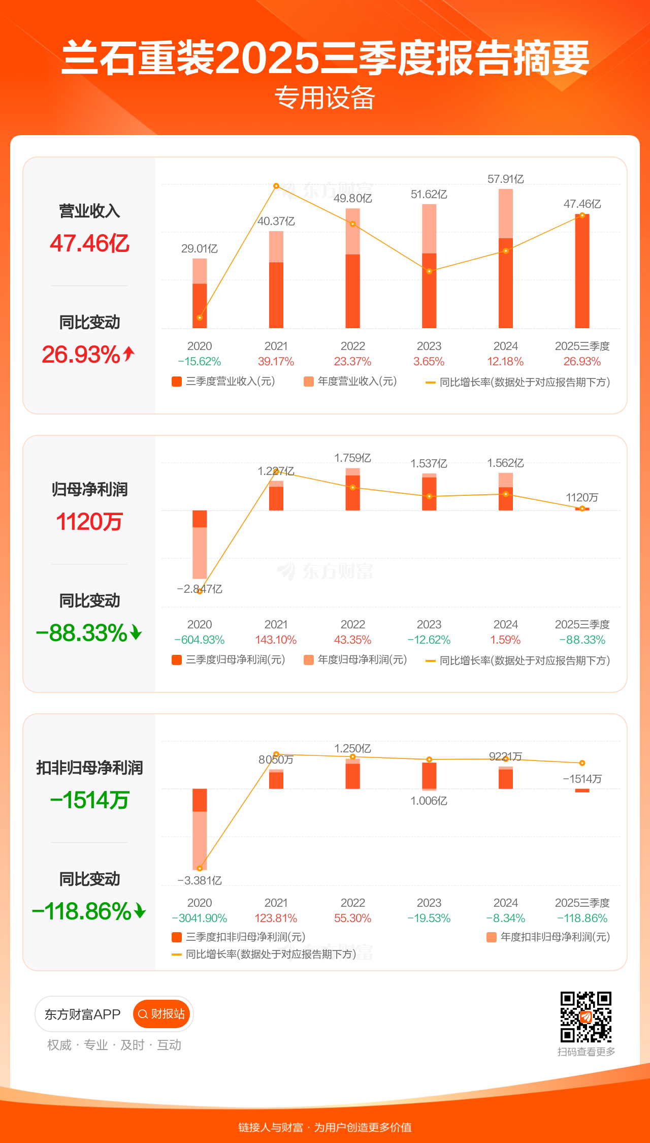 兰石重装10月31日发布2025年三季报显示,公司前三季实现营业收入47.46亿元,同比增长26.93%;归母净利润1119.64万元,同比下滑88.33%;扣非归母净利润-1513.79万元。