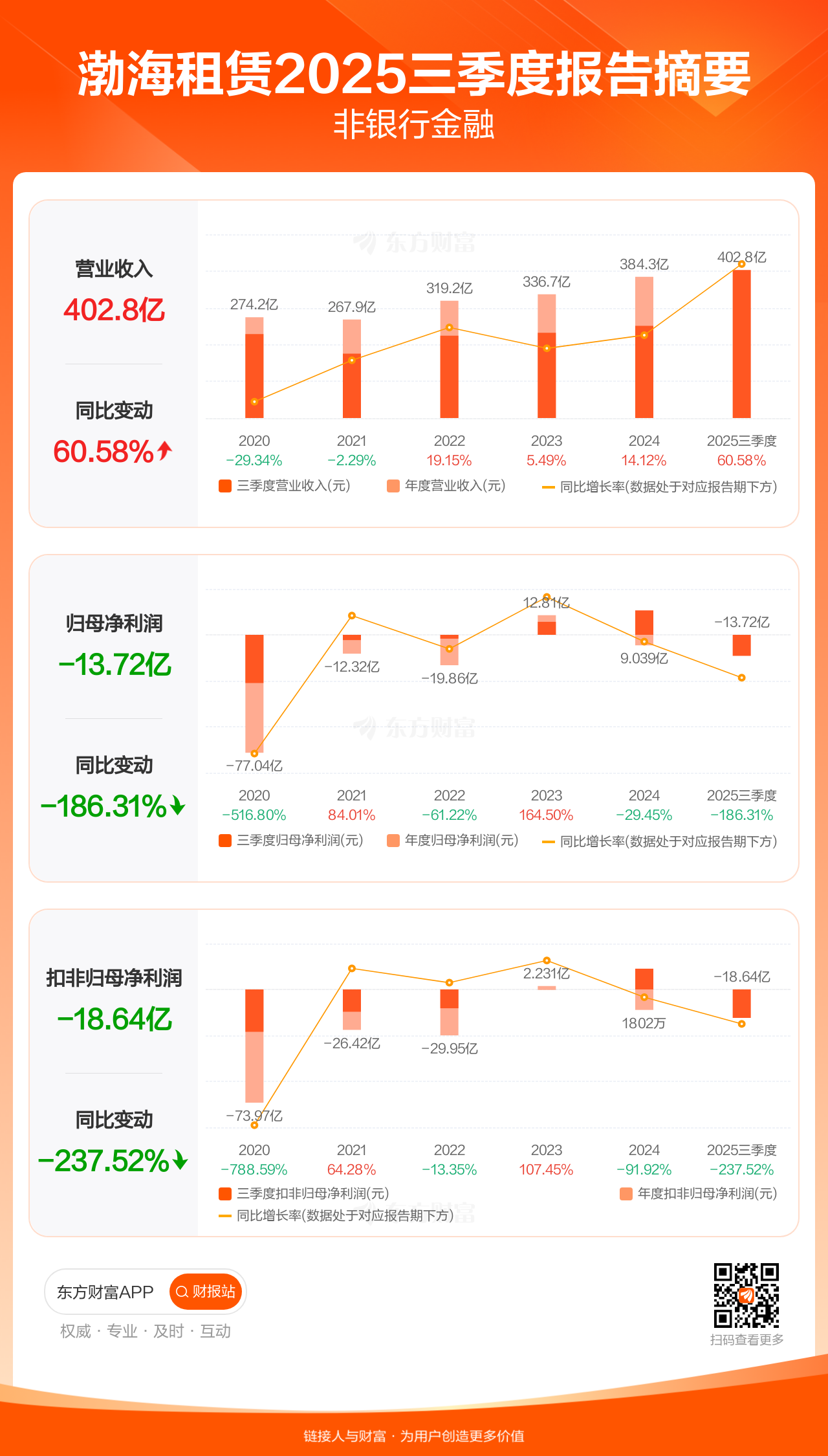 渤海租赁10月31日发布2025年三季报显示,公司前三季实现营业收入402.84亿元,同比增长60.58%;归母净利润-13.72亿元;扣非归母净利润-18.64亿元。