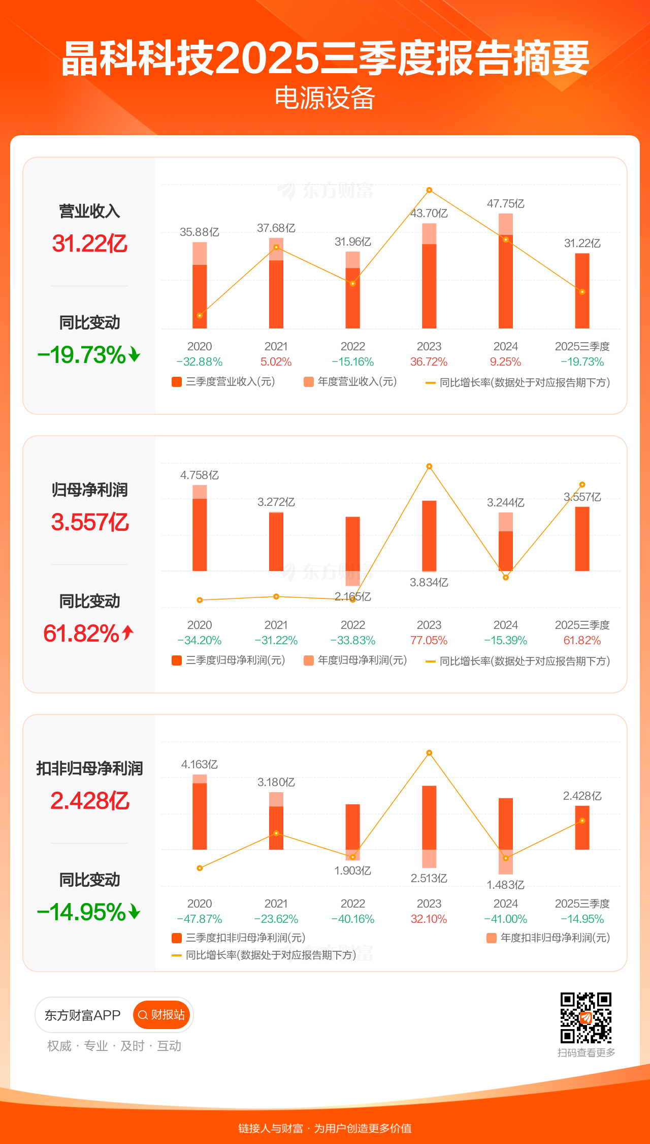 晶科科技10月31日发布2025年三季报显示,公司前三季实现营业收入31.22亿元,同比下滑19.73%;归母净利润3.56亿元,同比增长61.82%;扣非归母净利润2.43亿元,同比下滑14.95%。