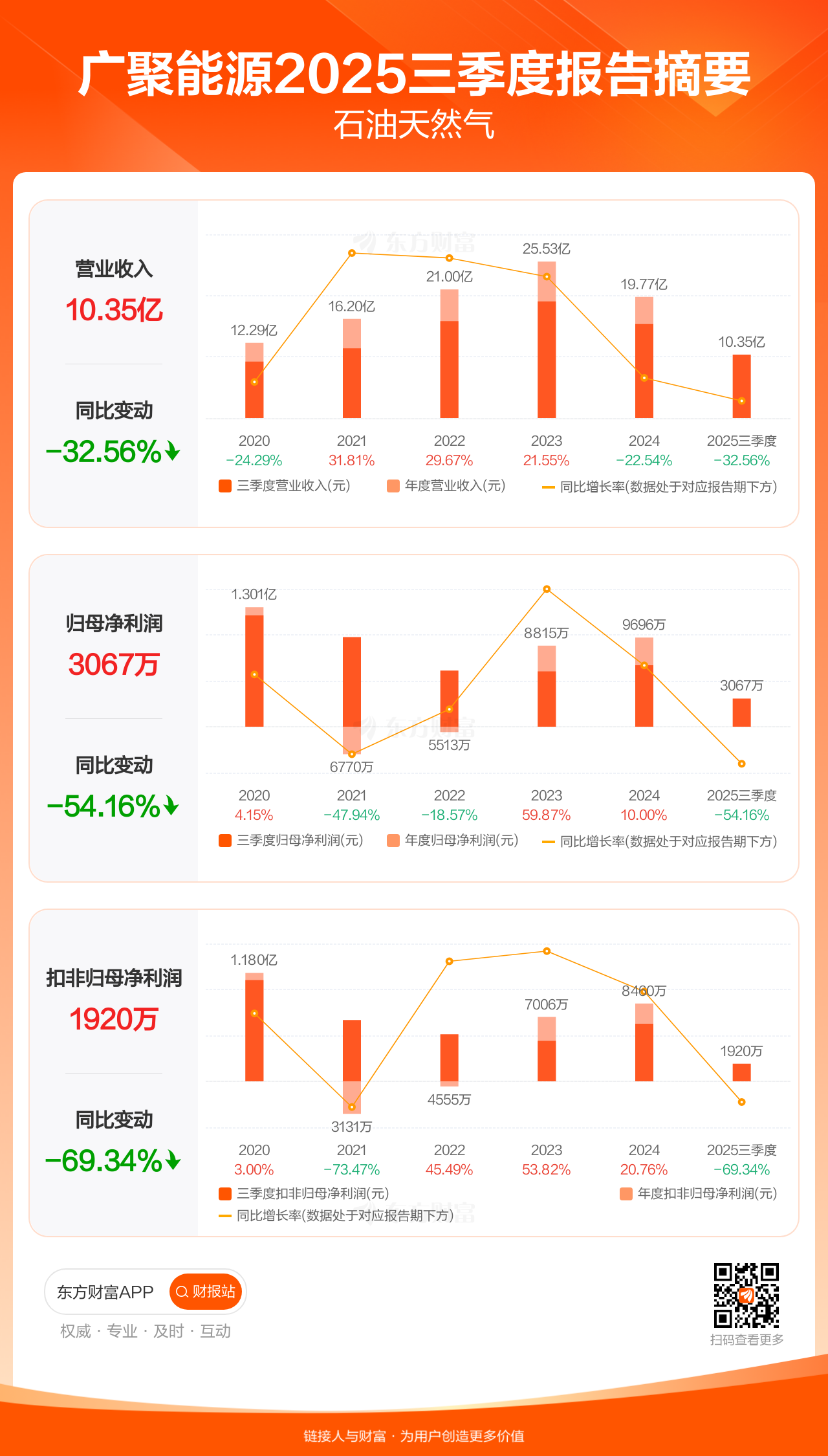 广聚能源10月31日发布2025年三季报显示,公司前三季实现营业收入10.35亿元,同比下滑32.56%;归母净利润3067.25万元,同比下滑54.16%;扣非归母净利润1920.13万元,同比下滑69.34%。