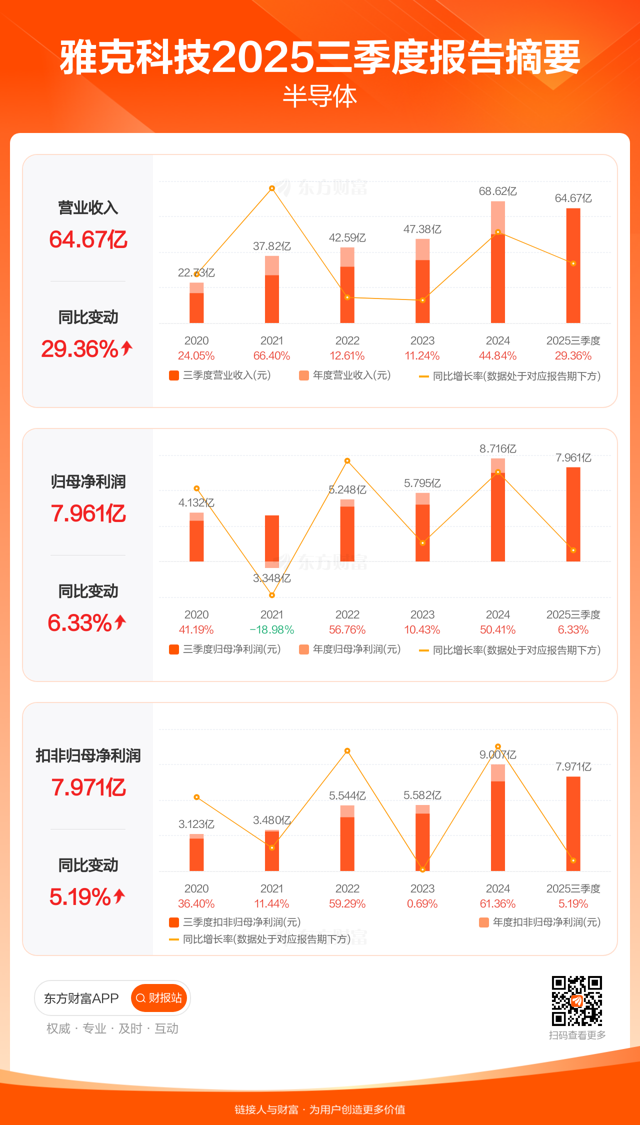 雅克科技10月31日发布2025年三季报显示,公司前三季实现营业收入64.67亿元,同比增长29.36%;归母净利润7.96亿元,同比增长6.33%;扣非归母净利润7.97亿元,同比增长5.19%。