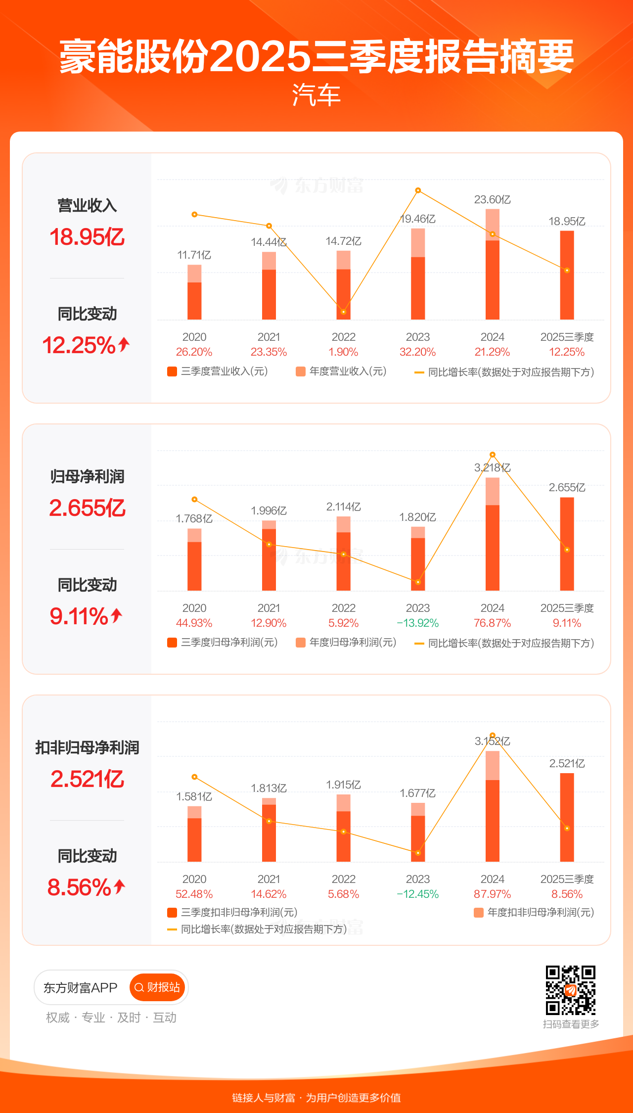 豪能股份10月31日发布2025年三季报显示,公司前三季实现营业收入18.95亿元,同比增长12.25%;归母净利润2.66亿元,同比增长9.11%;扣非归母净利润2.52亿元,同比增长8.56%。