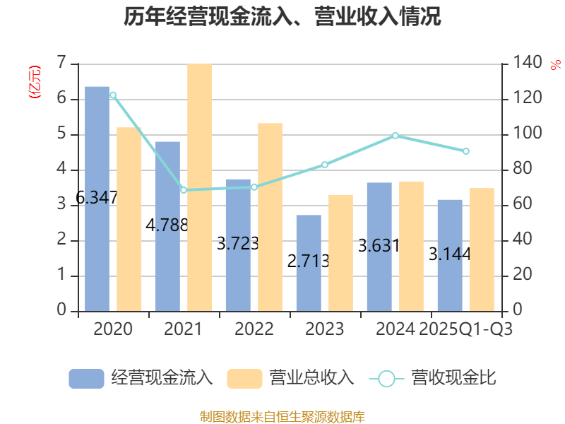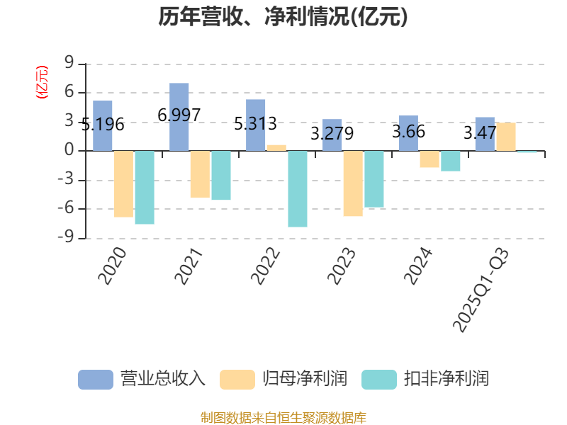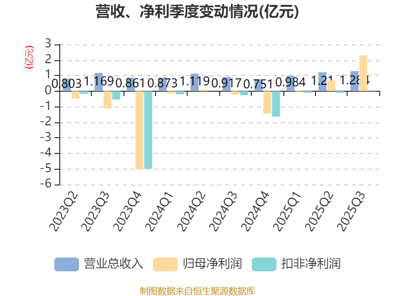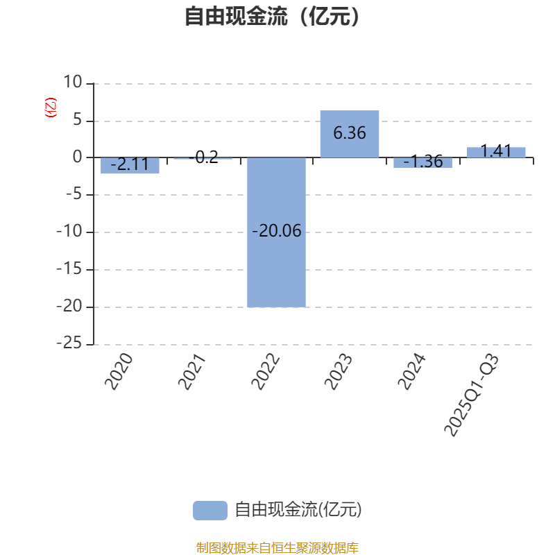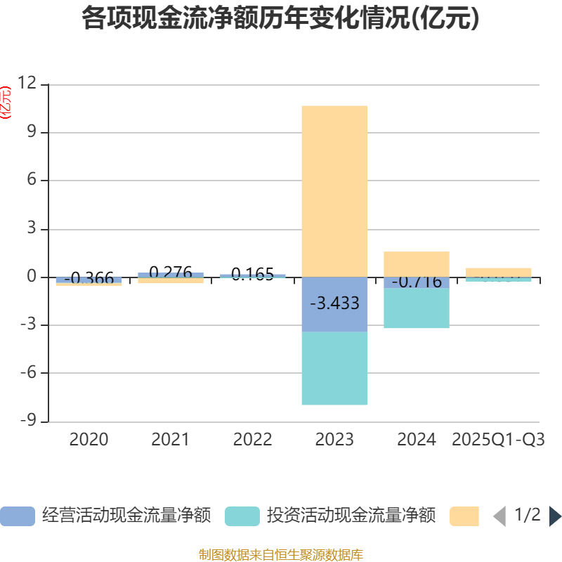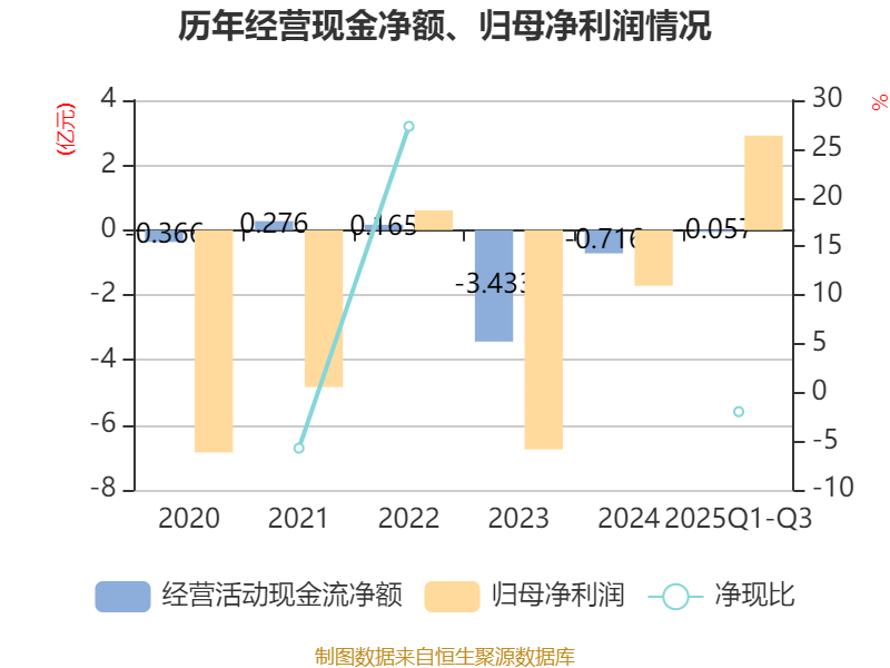 2025年前三季度,公司经营活动现金流净额为-571.63万元,同比增加6143.12万元;筹资活动现金流净额5554.81万元,同比减少7147.04万元;投资活动现金流净额-2322.96万元,上年同期为-2.32亿元。