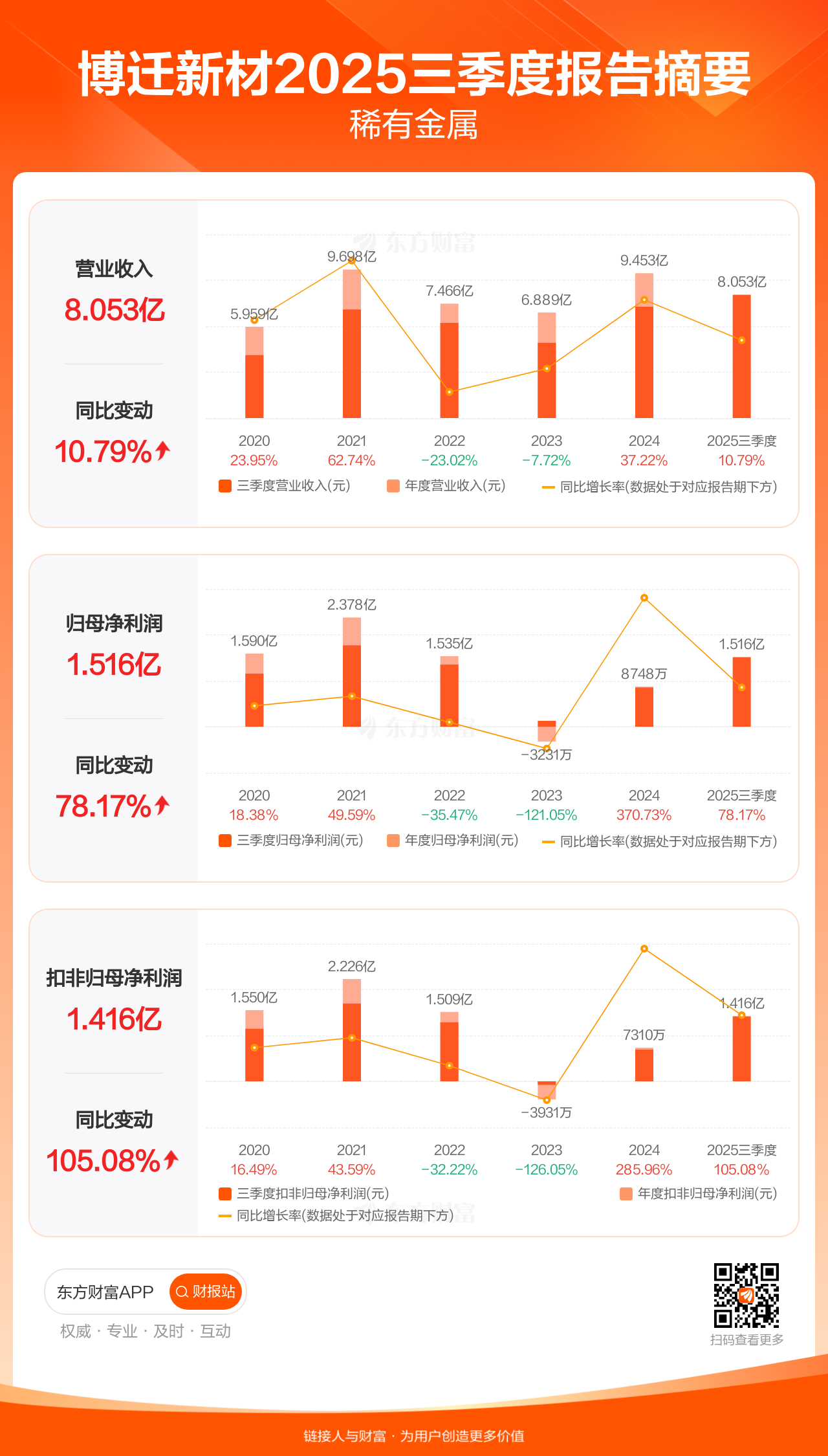 博迁新材10月28日发布2025年三季报显示,公司前三季实现营业收入8.05亿元,同比增长10.79%;归母净利润1.52亿元,同比增长78.17%;扣非归母净利润1.42亿元,同比增长105.08%。